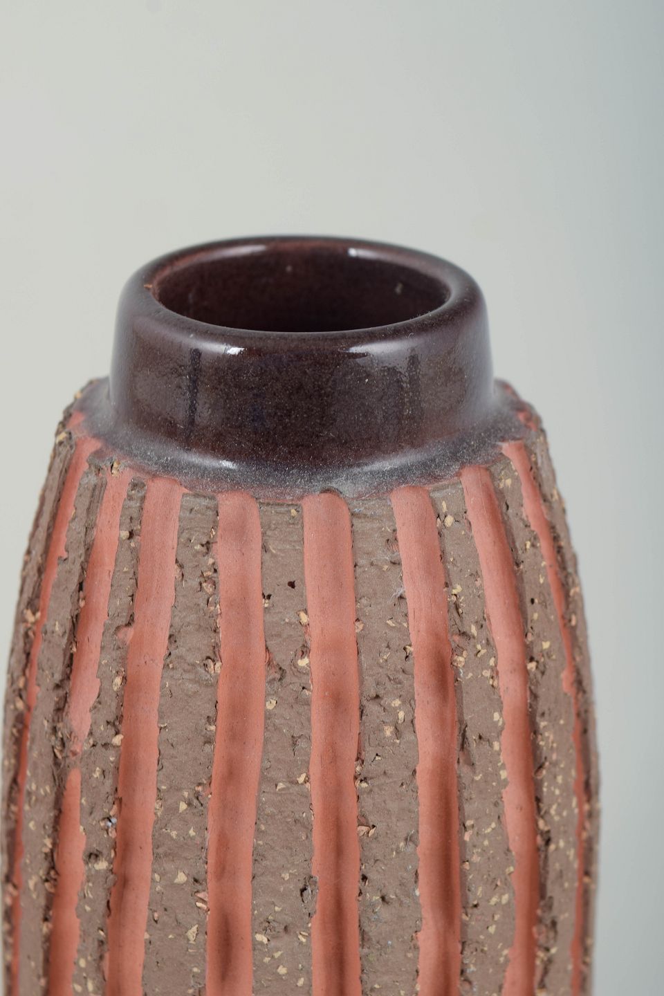 Lille cylindrisk vase i glaseret keramik med let indsnævret hals. Korpus er dekoreret med lodrette, reliefopbyggede striber i terrakottafarvede toner mod en mørkere, let spraglet bundglasur, afsluttet med en lys, groft struktureret fod. Dekorationen giver et markant taktilt og modernistisk udtryk. Modelnummer 4594.