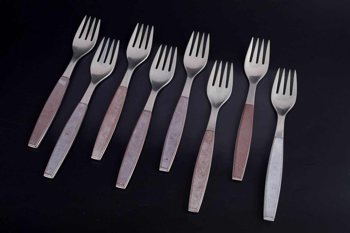 Sæt bestående af otte middagsgafler i rustfrit stål med brune håndtag. Modellen er fra Strata-serien.
