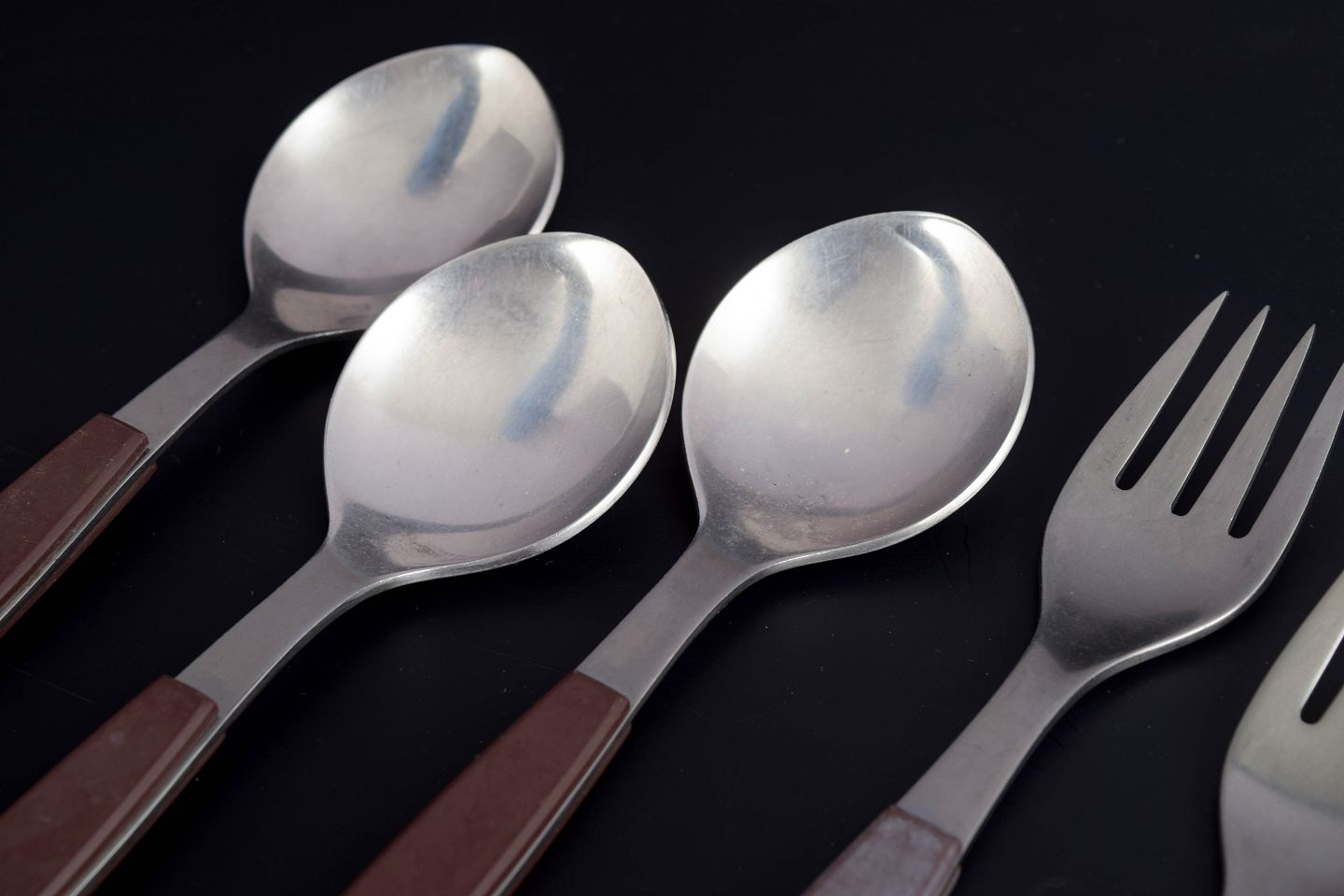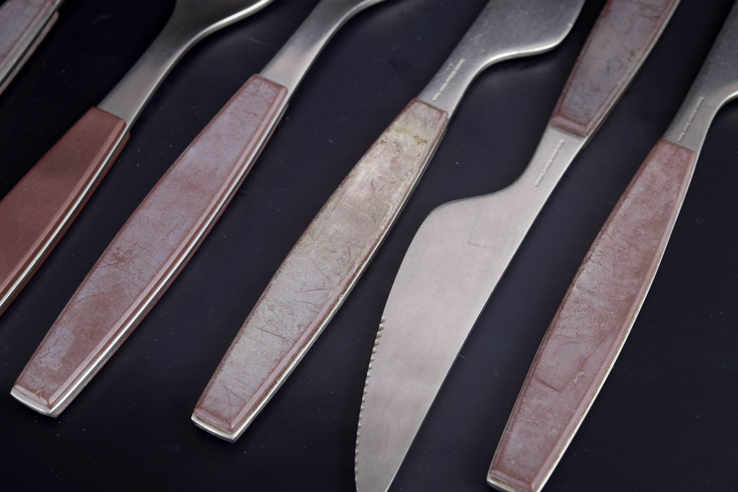Sæt bestående af tre middagsknive, tre middagsgafler og tre spiseskeer i rustfrit stål med brune håndtag. Modellen er fra Strata-serien.