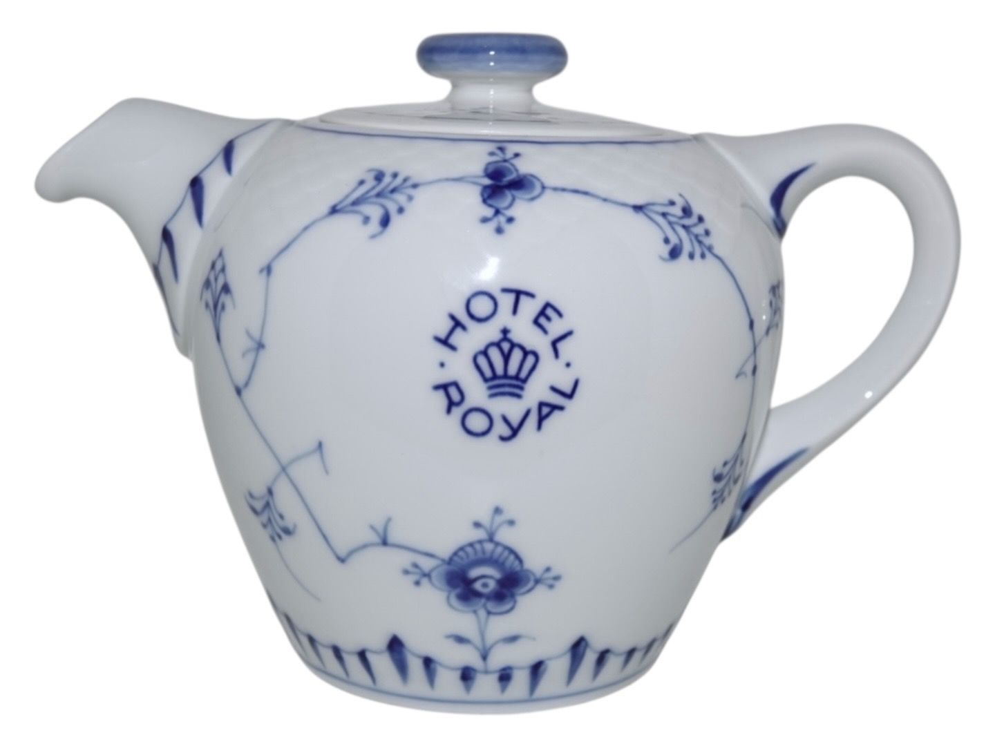 Bing & Grøndahl Blåmalet / Musselmalet tykt jernporcelæn, lille tekande med logo fra Hotel Royal.