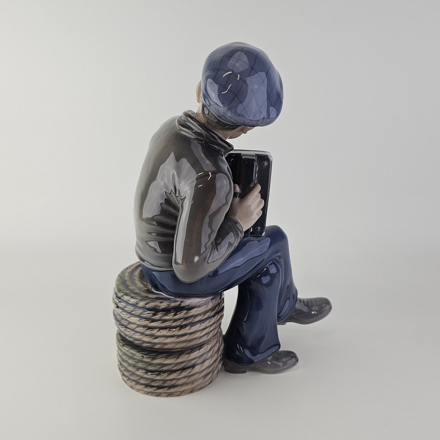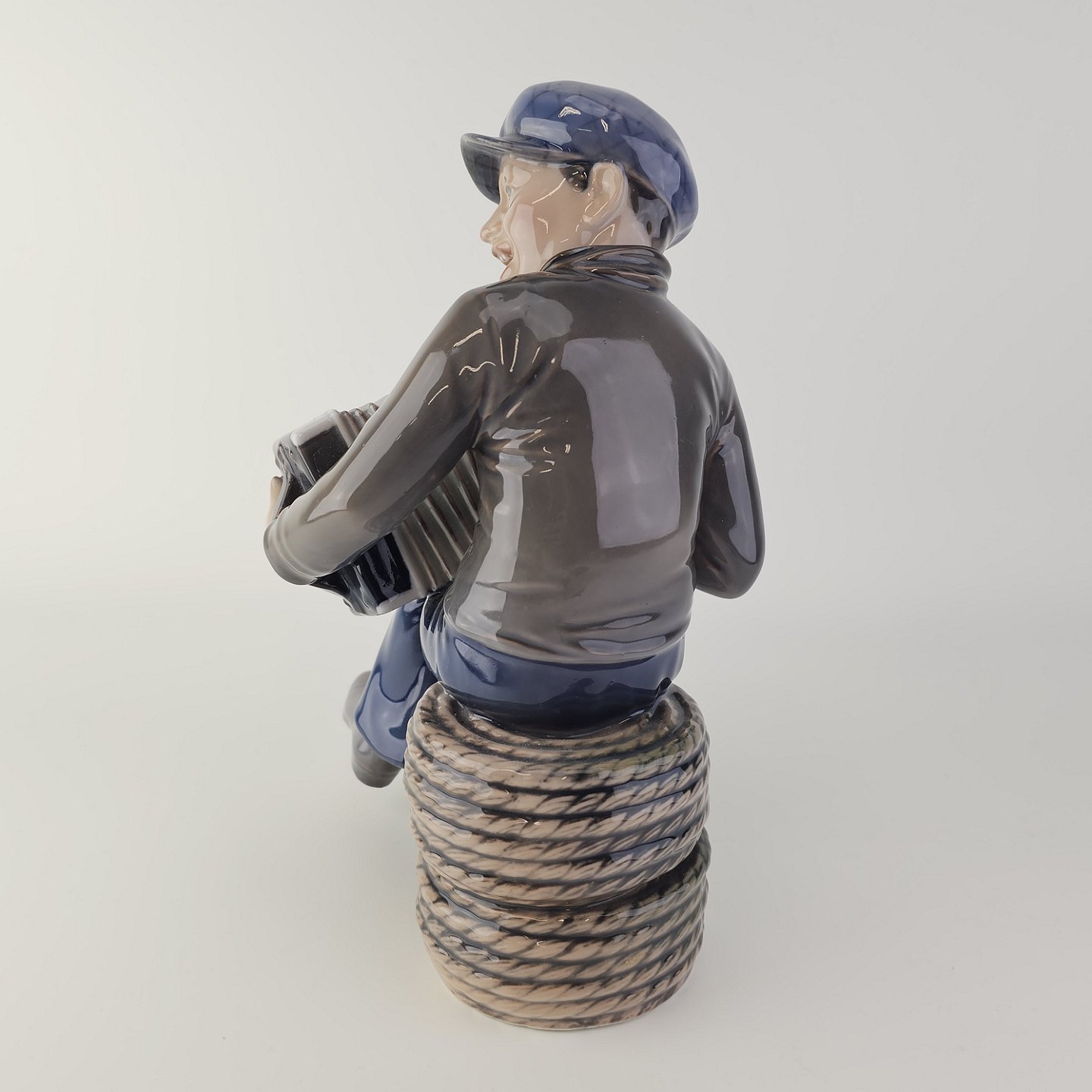 Figur i hvidt porcelæn med motiv af en dreng som spiller harmonika