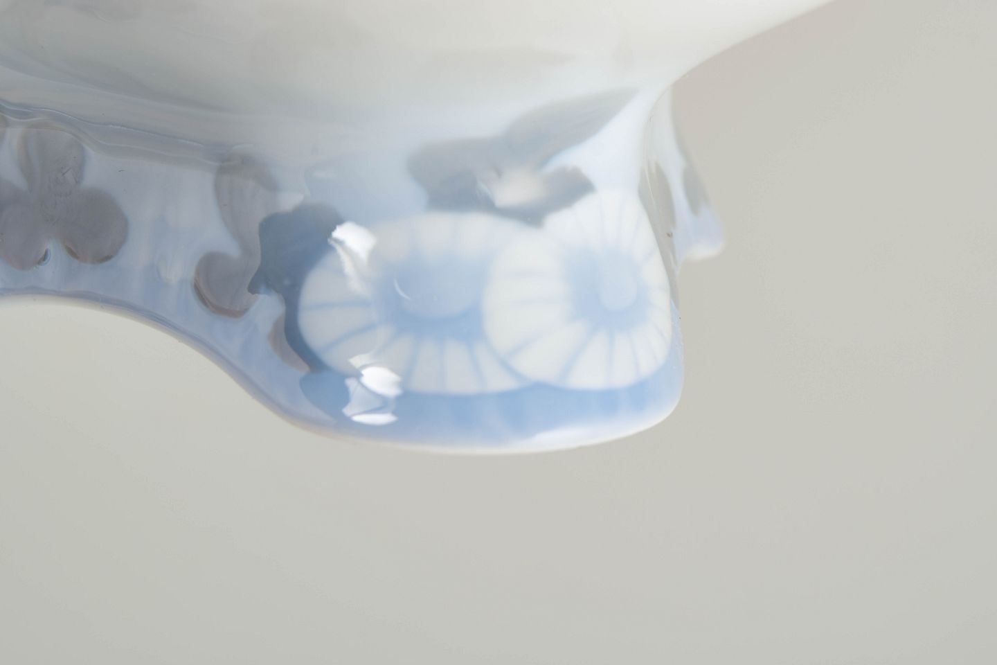 Lav fodskål i porcelæn fra serien Skærsommernatsdrøm, model 73/10032. Skålen har en blødt svungen form med lav fod og dekoration i afdæmpede blå nuancer.