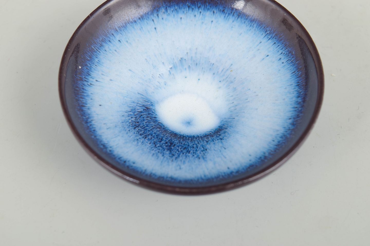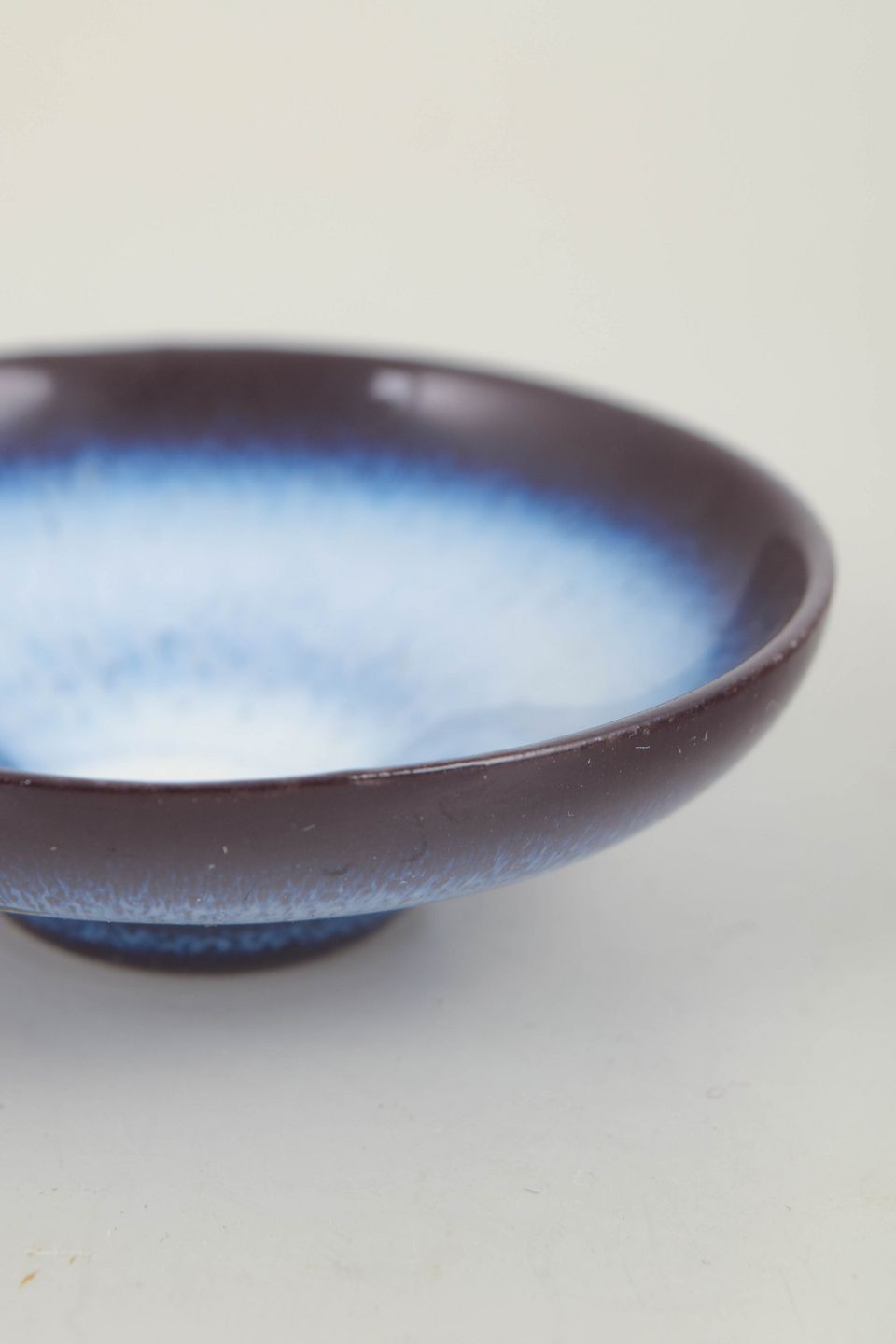 Lille lav skål i glaseret stentøj med blødt rundet form. Udført med mørk rand og lys, levende blå glasur i midten, karakteristisk for Gunnar Nylunds eksperimenterende glasurarbejder i mindre formater. Skalaen og proportionerne understreger skålens miniaturekarakter.