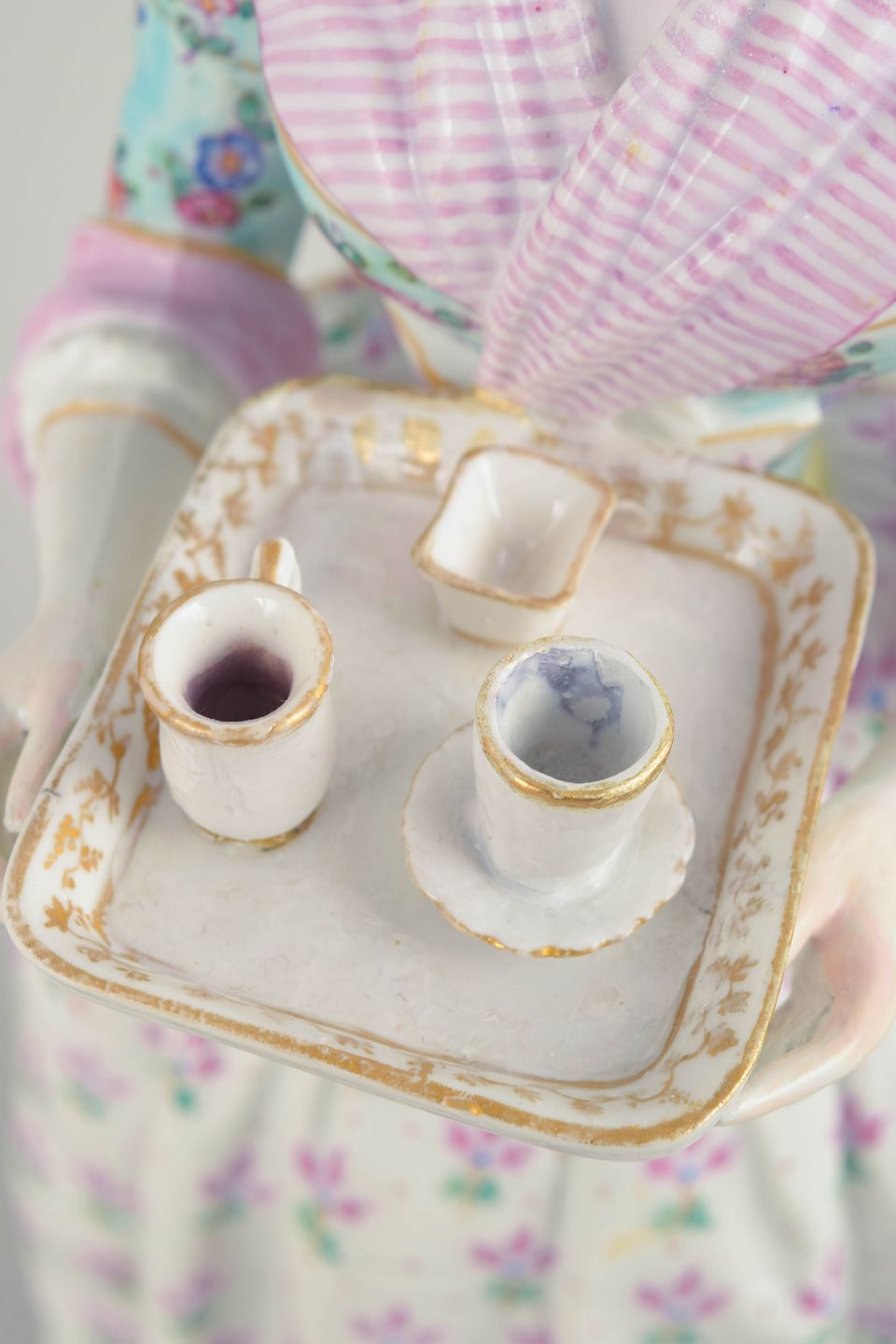 Meissen var Europas første hårdporcelænsfabrik (grundlagt 1710) og blev i 1700-tallet førende inden for skulpturelle porcelænsfigurer til hof og samlere. Perioden med Marcolini-mærket (sent 1700-tal til tidligt 1800-tal) er kendt for teknisk høj kvalitet, raffineret modellering og udsøgt håndmalet staffering. Motivet “La Belle Chocolatière” blev et ikon for rokokoens og oplysningstidens fascination af hverdagslige, elegante scener, og Meissens fortolkninger regnes blandt fabrikkens mest prestigefyldte figurmodeller.