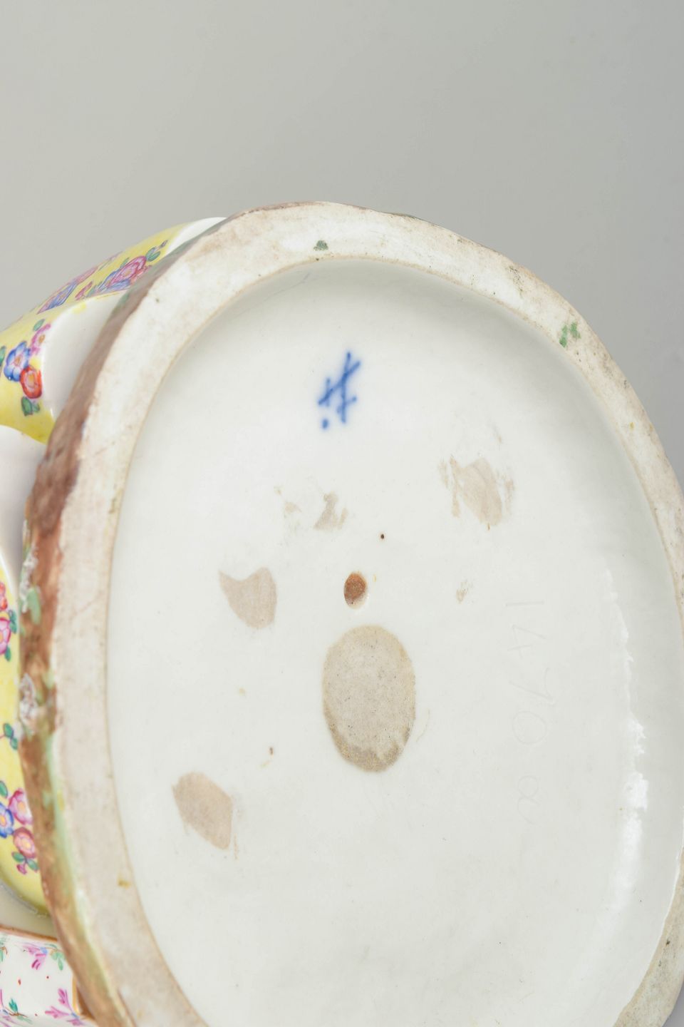 Stor Meissen porcelænsfigur fremstillet efter Jean-Étienne Liotards berømte motiv “La Belle Chocolatière” (1744). Figuren viser en kvinde i 1700-talsdragt med serveringsbakke og er rigt bemalet med blomsterdekoration, detaljeret ansigtsmaling og stafferede elementer. Udført efter model nr. 1470 og forsynet med Marcolini-mærke, dateret til ca. 1790’erne.