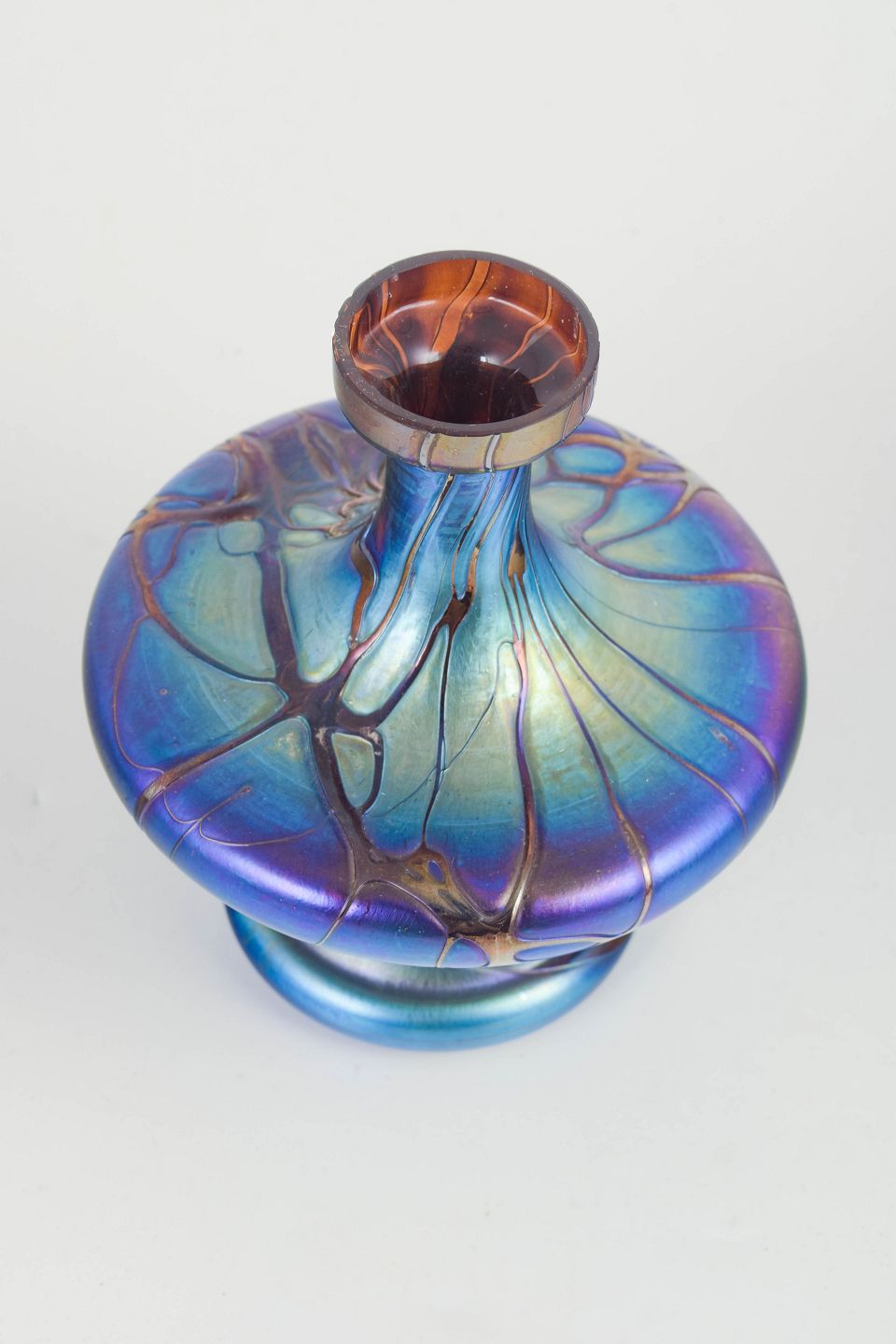 Dekorativ Art Nouveau-vase i iriserende kunstglas med blåviolet skær og organiske, “flydende” tråd-/åremønstre i overfladen. Formen er balusterpræget med bred, lav bug og smal hals; modelleringen fremhæver glassets farvespil og lysrefleksioner.