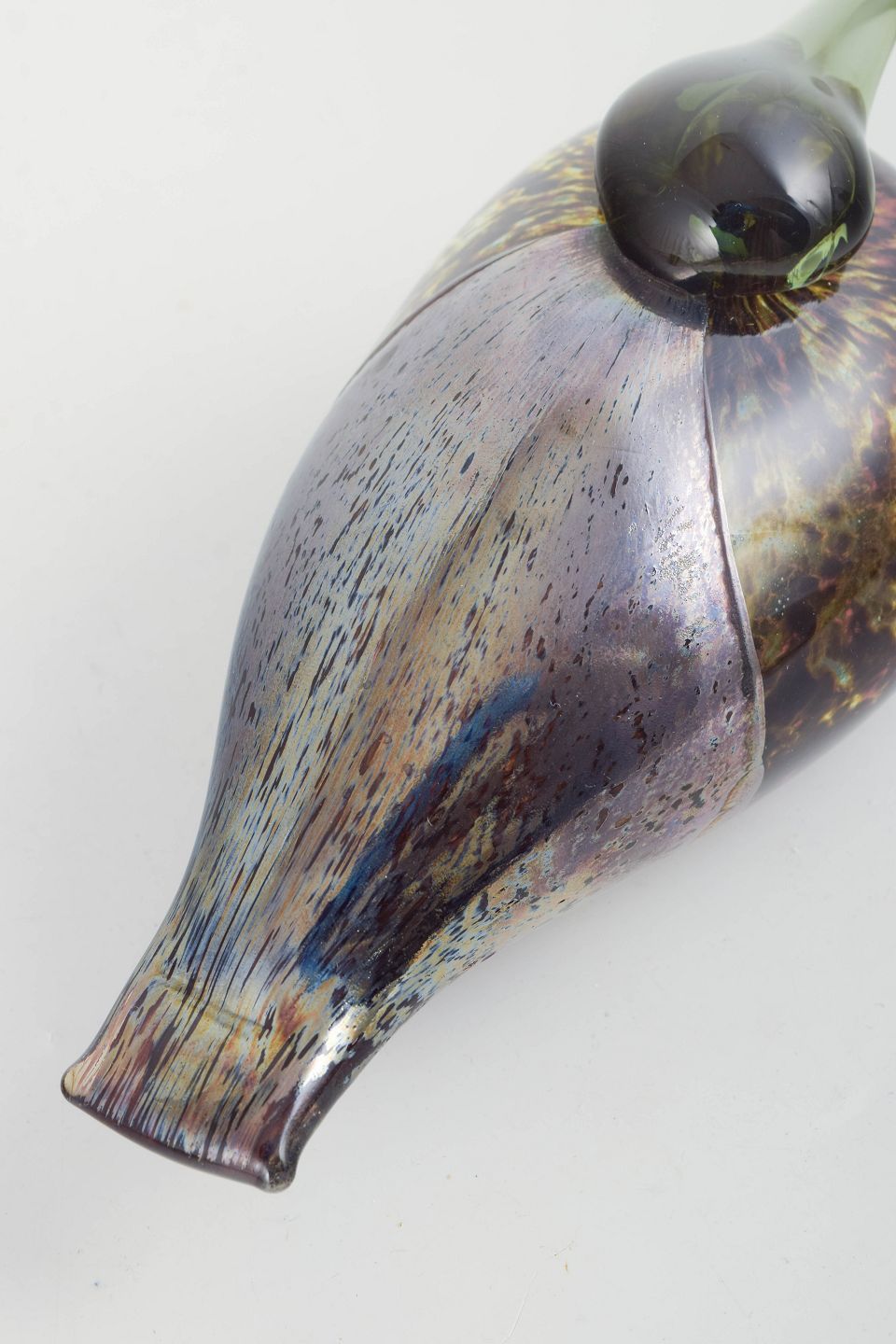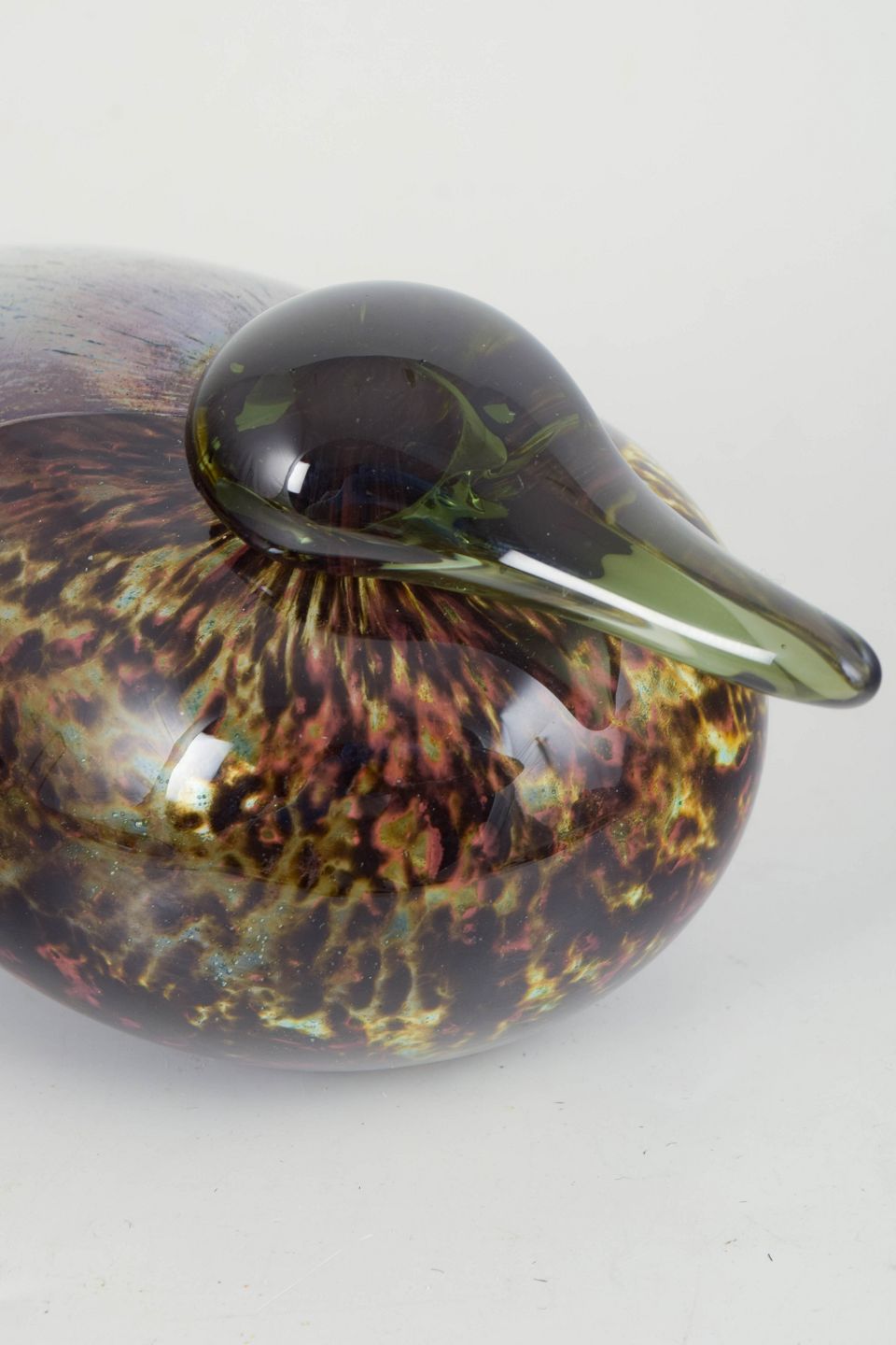 Stor håndblæst fugleskulptur i flerfarvet kunstglas med dybe, iriserende nuancer og karakteristisk dråbeformet silhuet. Overfladen viser levende spil i glasset med organiske farveovergange, typisk for værkstedets eksperimenterende tilgang i perioden. Modellen fremstår som en del af Oiva Toikkas ikoniske fugleunivers.