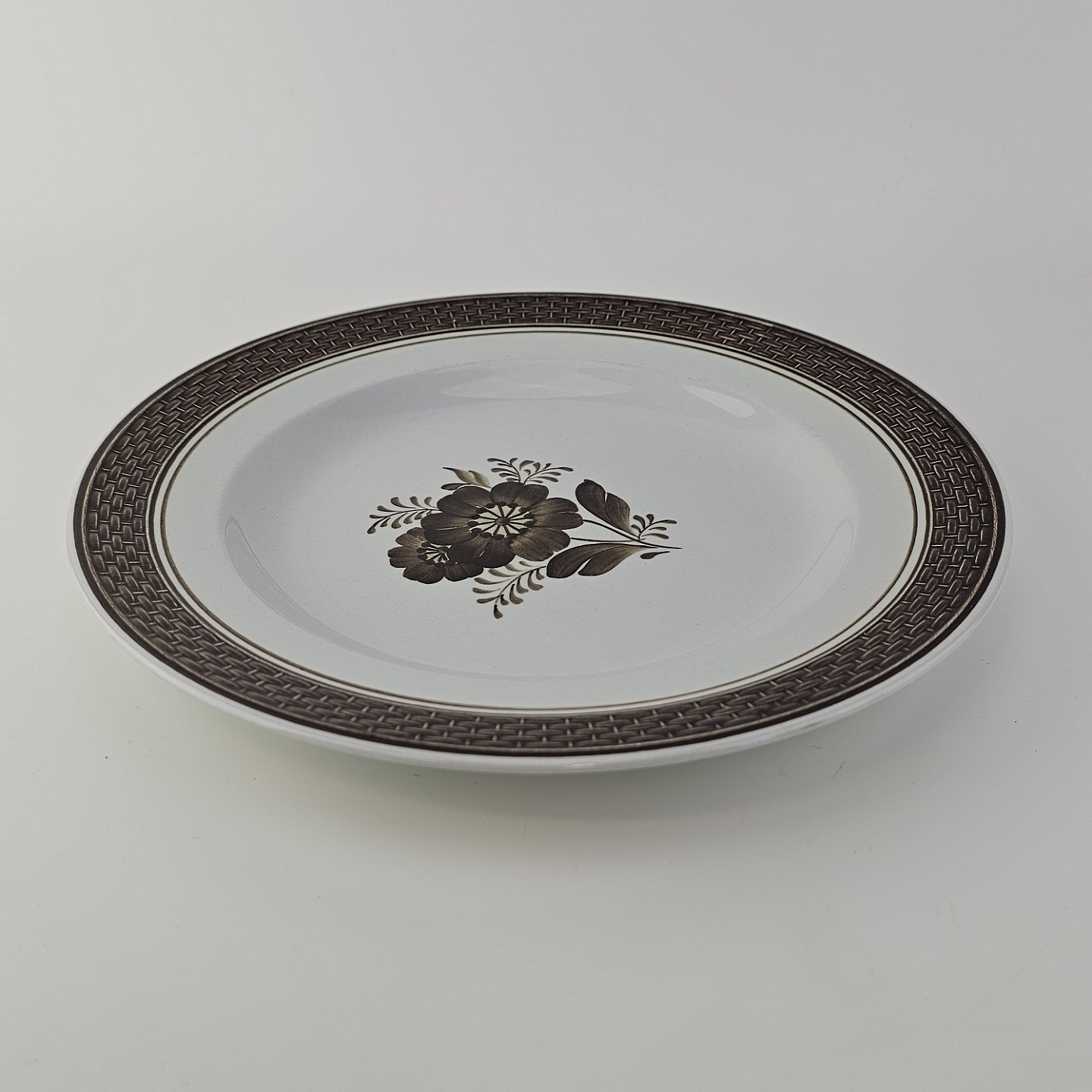 Fajancestellet med flettet kant og dekoration af brune blomster på lys baggrund med brun kant