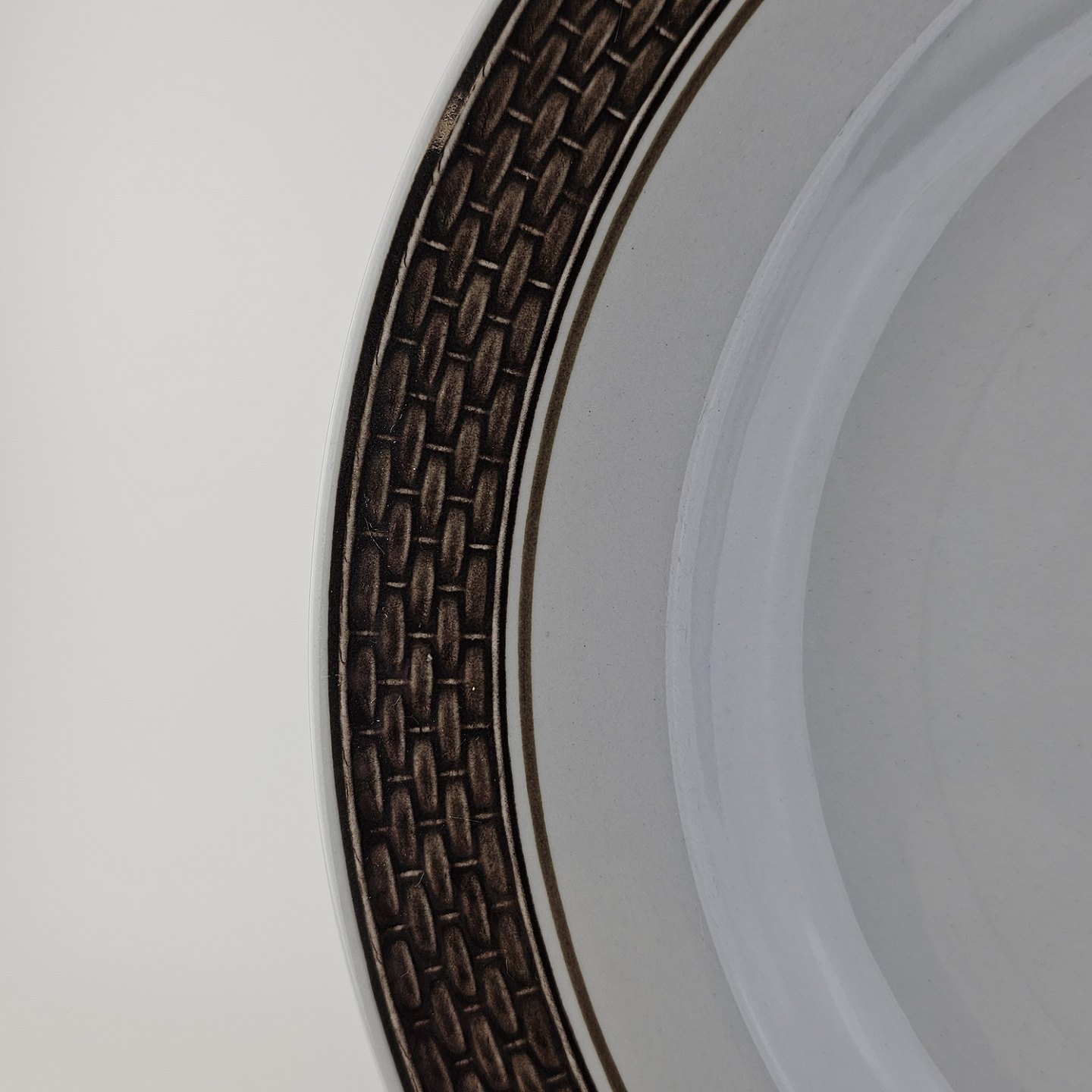 Fajancestellet med flettet kant og dekoration af brune blomster på lys baggrund med brun kant