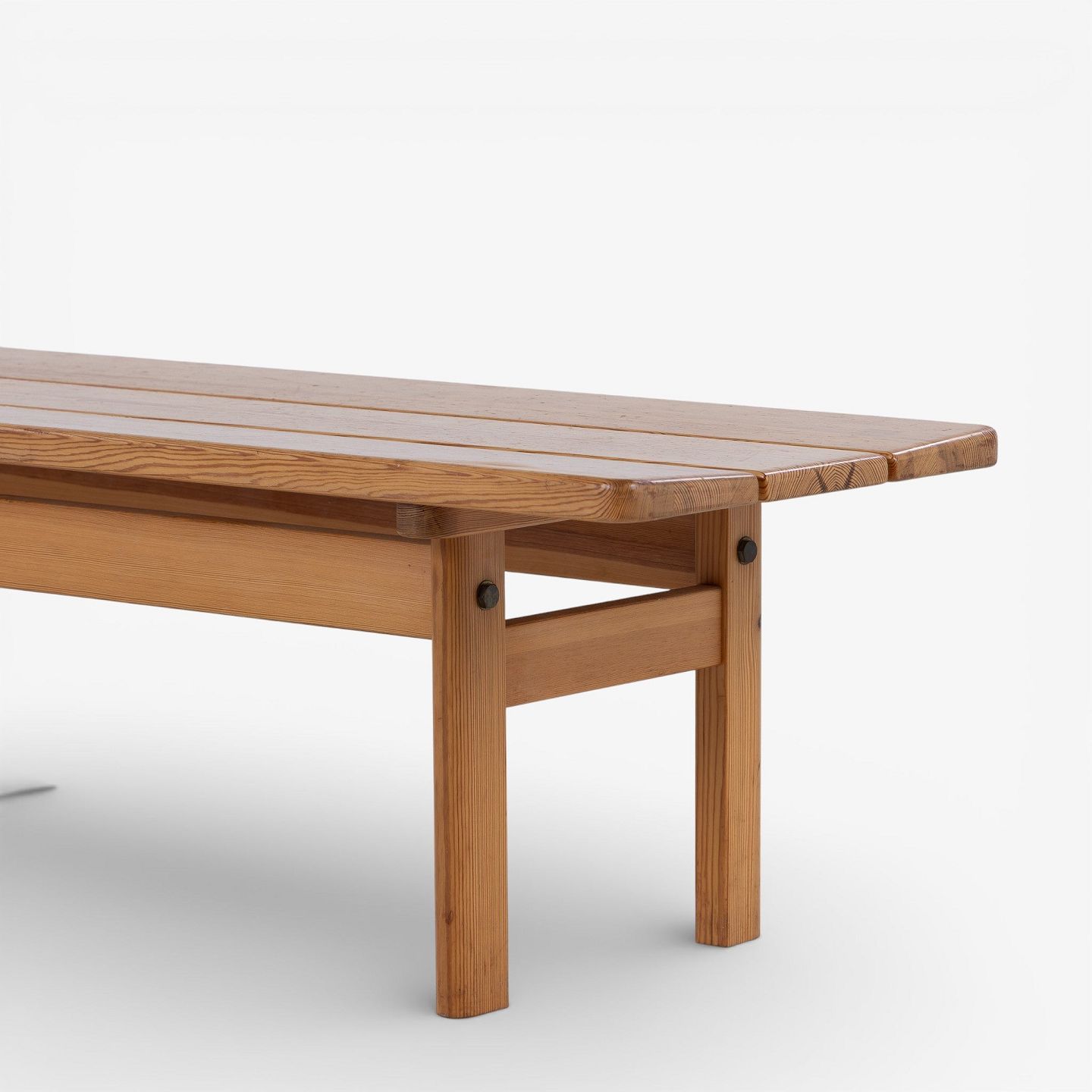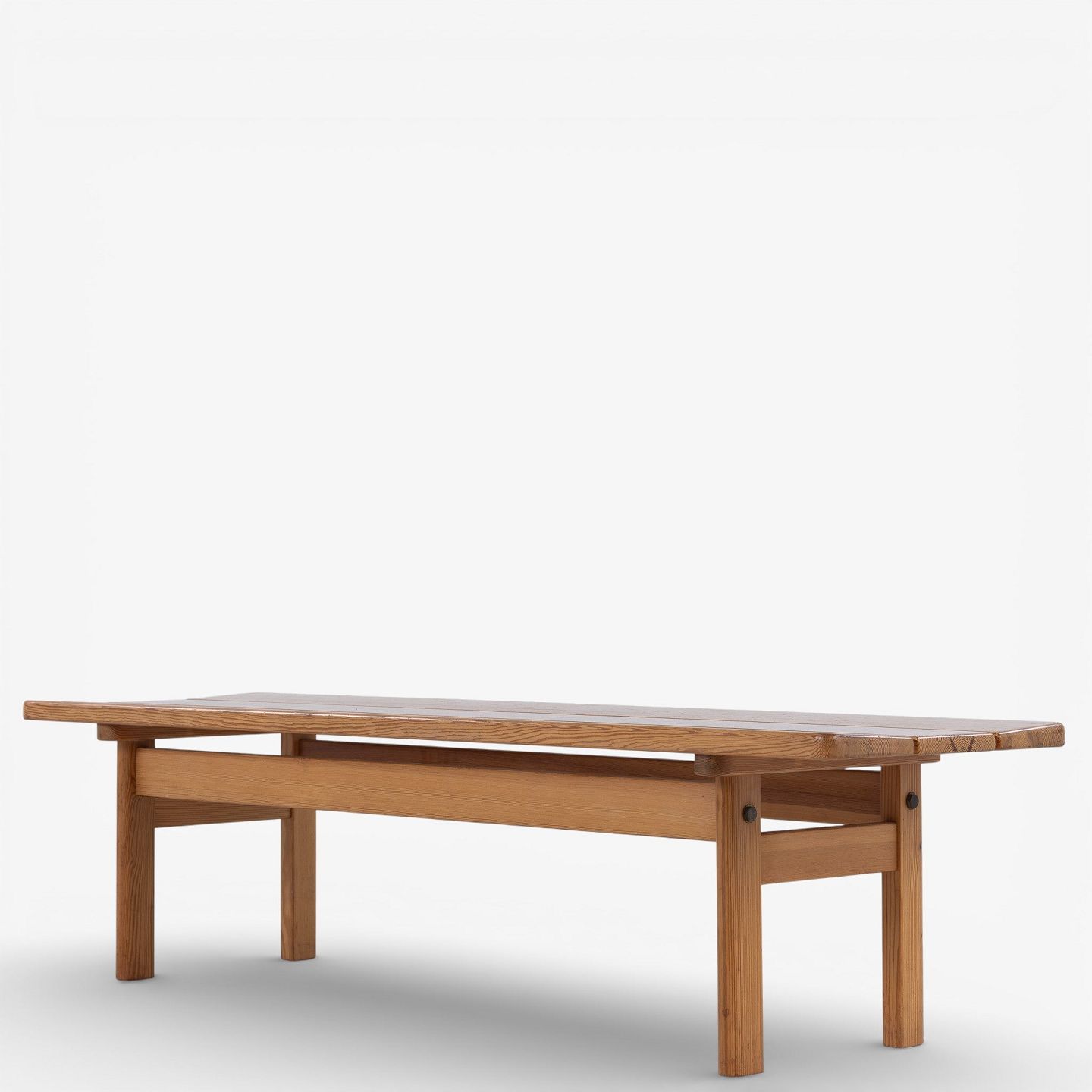 Bænk i massiv, lakeret fyrretræ. Mærket fra producent.