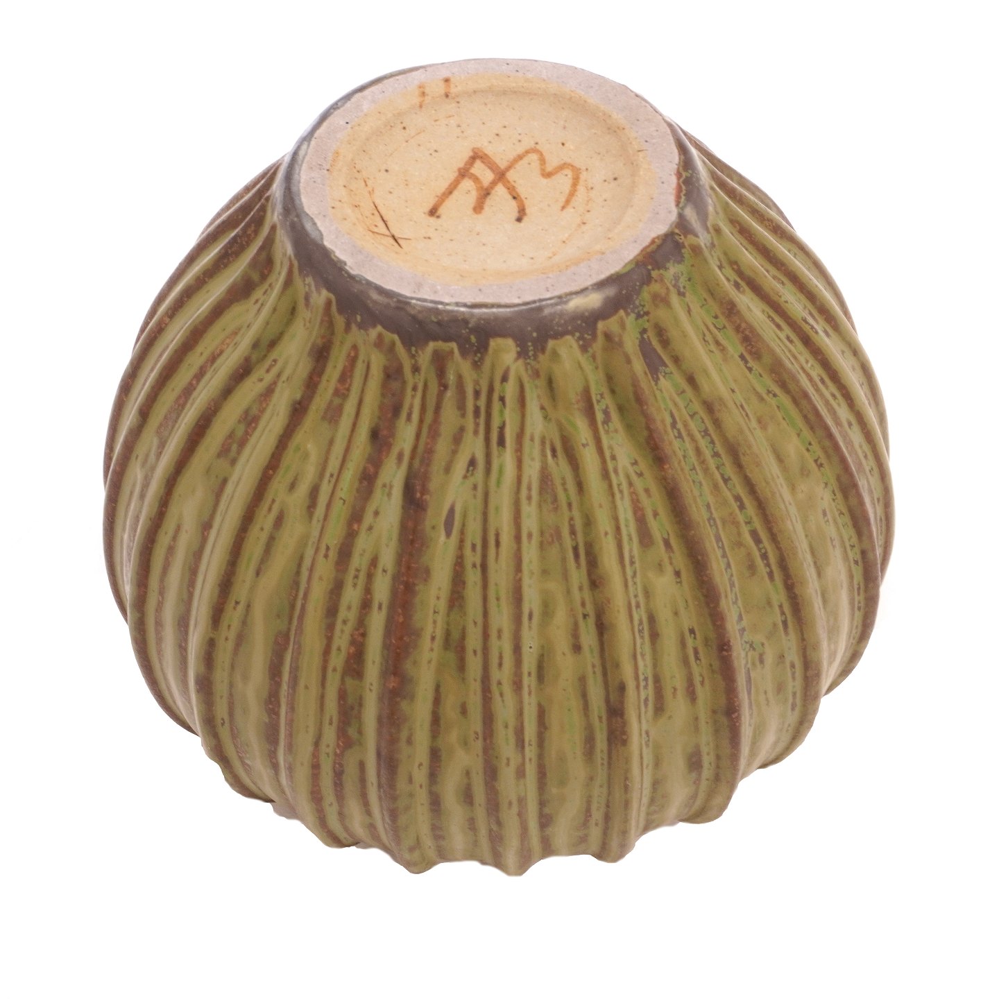 Arne Bang bredriflet vase med brungrøn glasur og hvælvet kant. Signeret. H: 10,5. D: 13cm