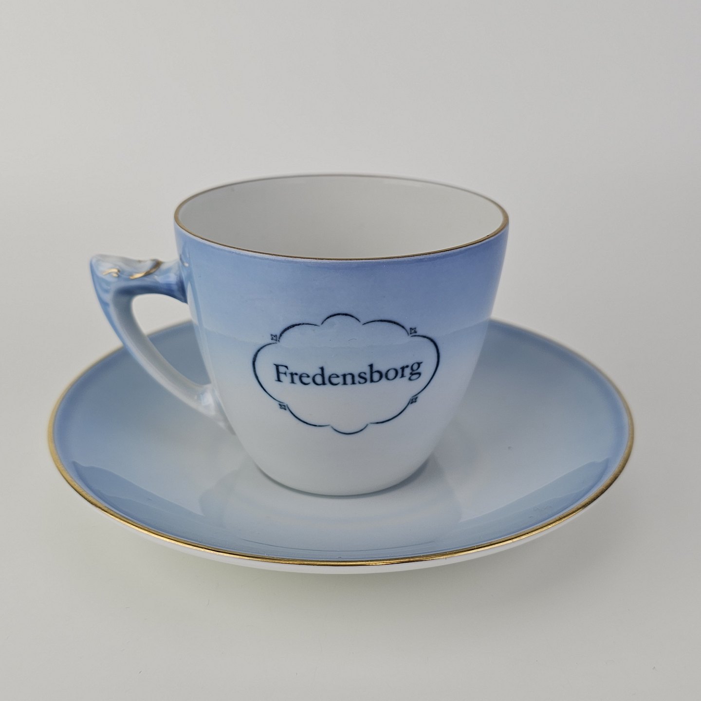 Kopper med underkopper i blåmalet porcelæn dekoreret med motiver af danske slotte og guldkant