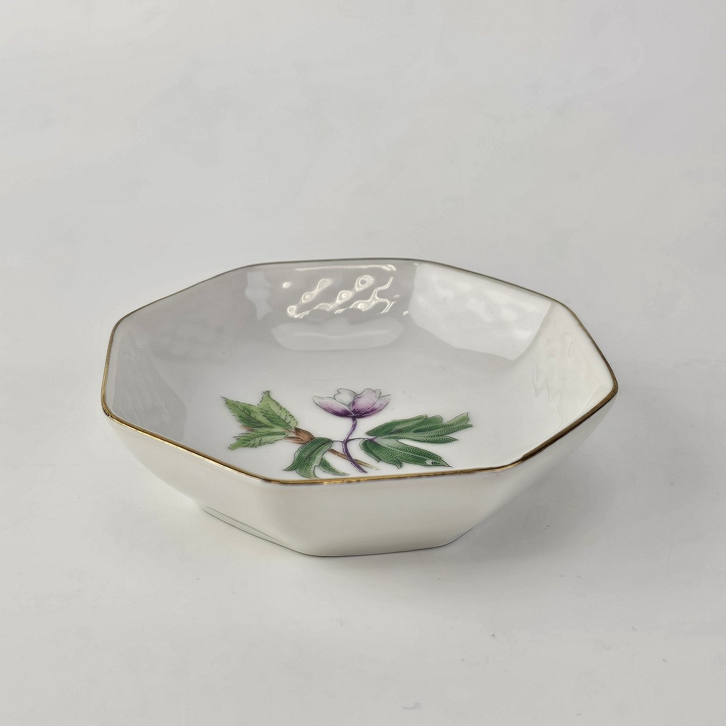 Frigga Anemone er cremefarvet porcelæn dekoreret med motiv af anemoner og bøgeløv med guldkant