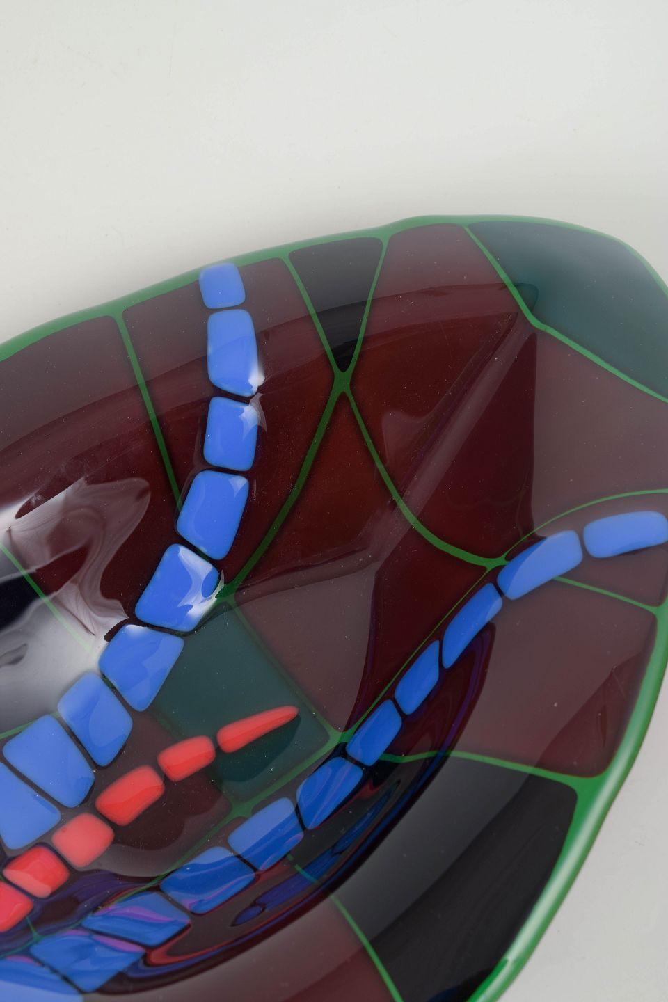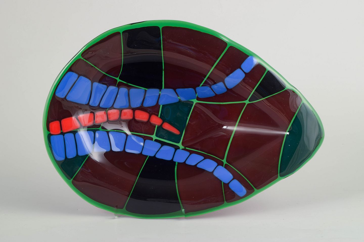Organisk formet stykke kunstglas med geometrisk, mosaiklignende komposition i dybe farvetoner; udført som unika og nummereret.