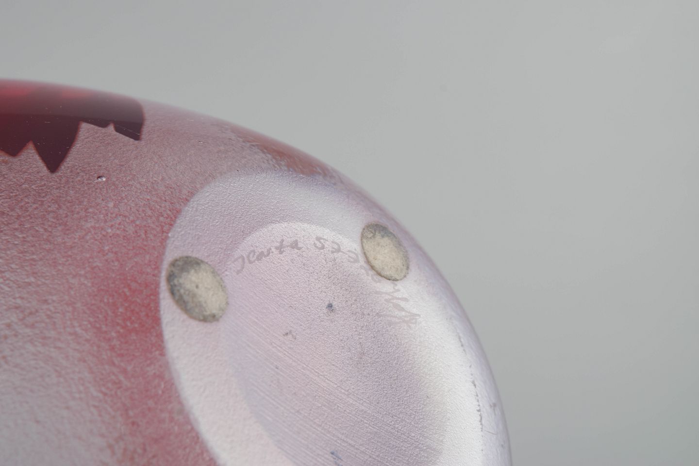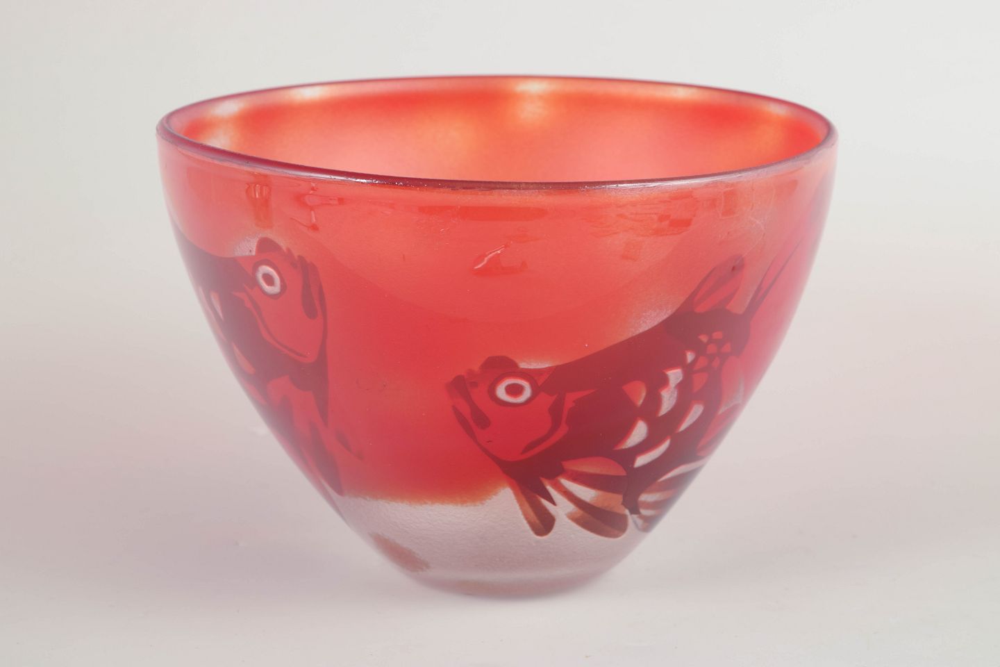 Skål i klart og rødtonet kunstglas med indsmeltede fiskemotiver og matteret bund, signeret Hoff.