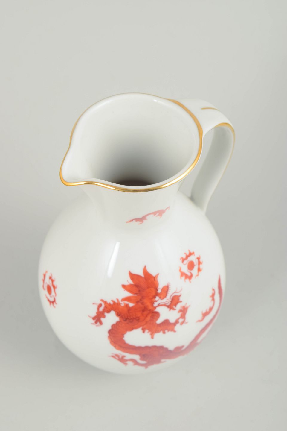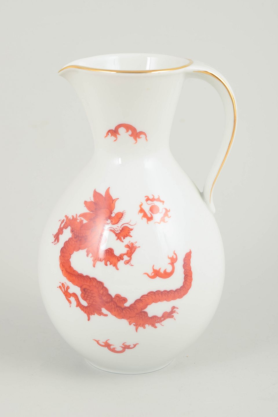 Balusterformet kande i hvidglaseret porcelæn dekoreret med rød Mingdrage og forgyldt kant. Modellen er fremstillet i Meissen-området og er ikke produceret af den kongelige Meissen-manufaktur.