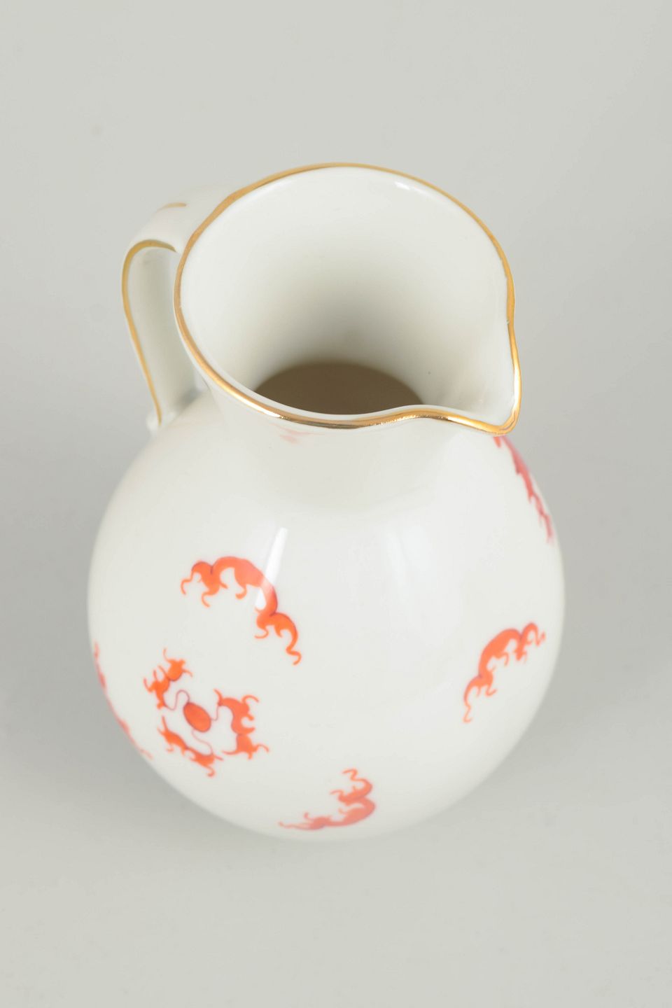 Balusterformet kande i hvidglaseret porcelæn dekoreret med rød Mingdrage og forgyldt kant. Modellen er fremstillet i Meissen-området og er ikke produceret af den kongelige Meissen-manufaktur.