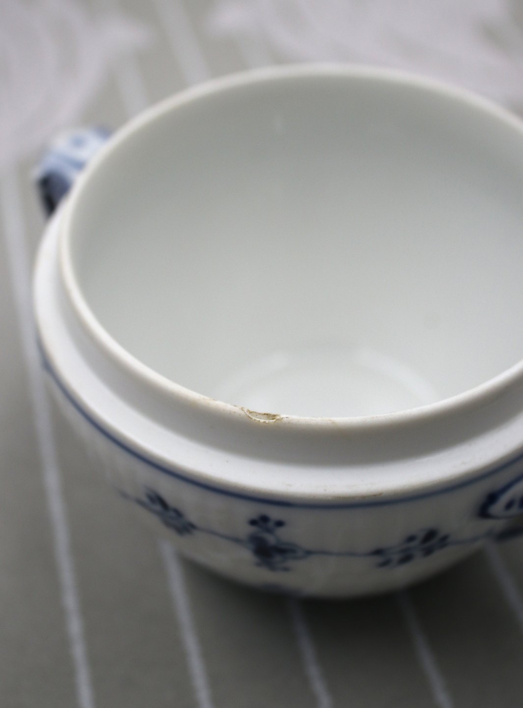 The sugar bowl has a small chip on the edge of the sugar bowl itself under the lid.
