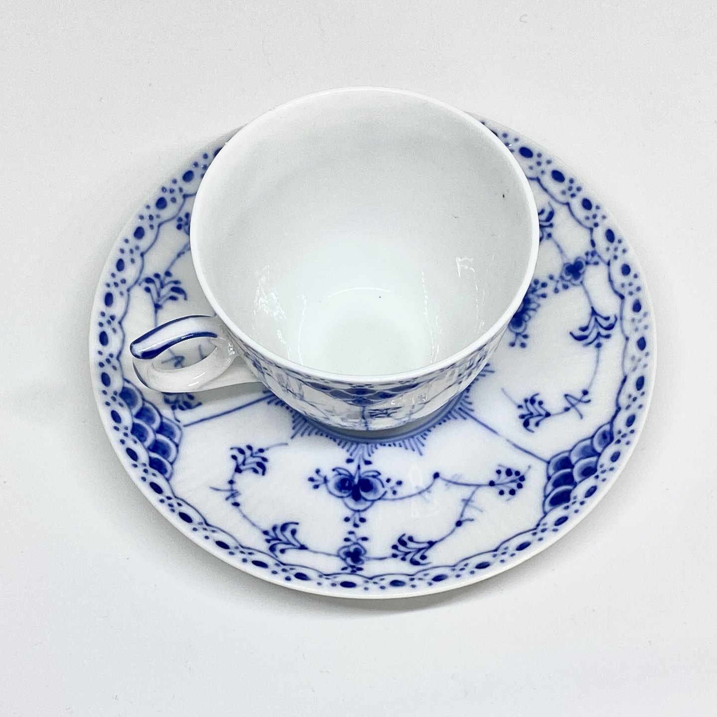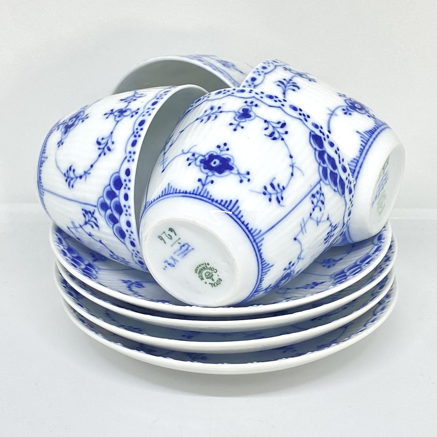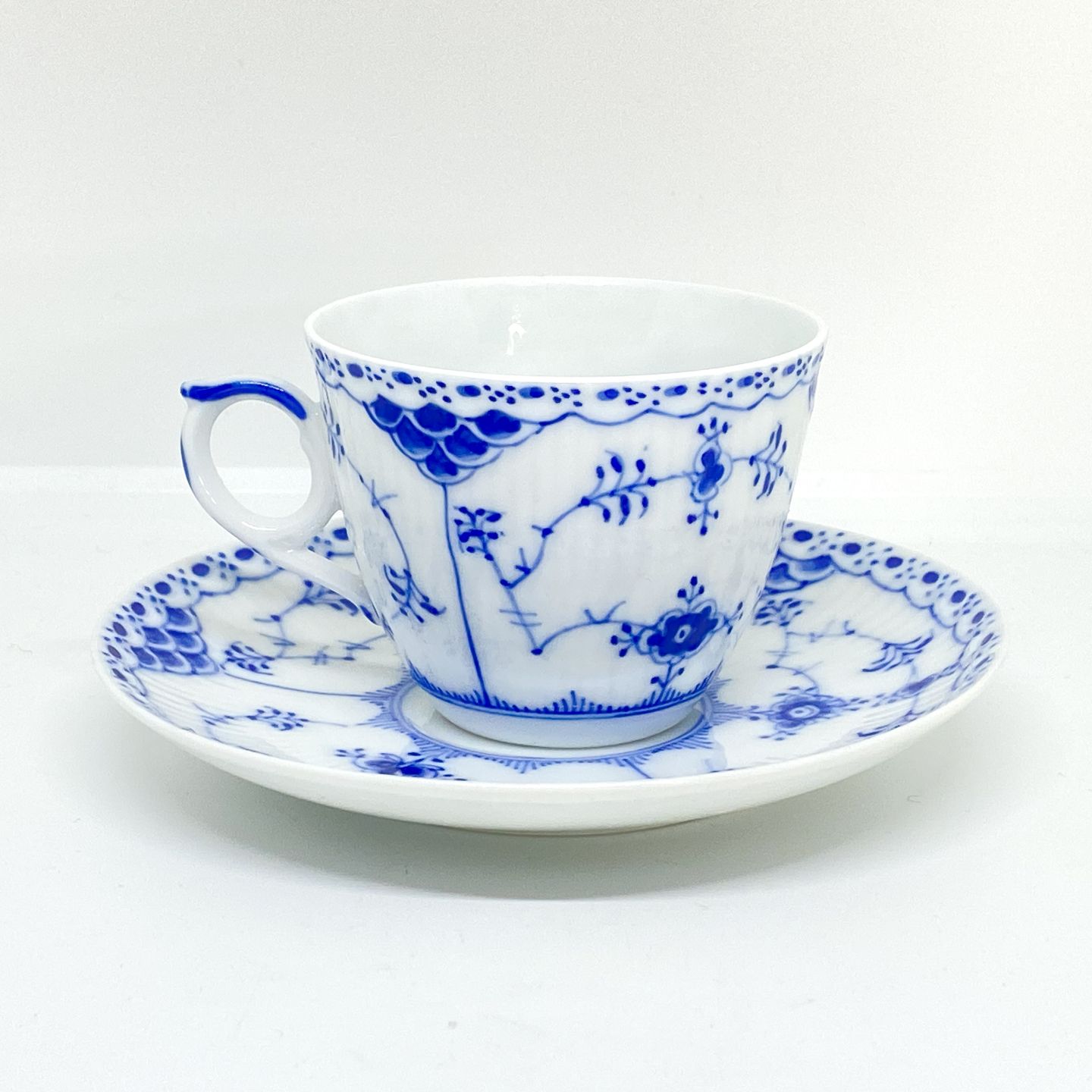 Royal Copenhagen/Kgl Blue Fluted half lace coffee cup and saucer. Decoration number cup 1/626. Decoration number saucer 1/626-525-656-669.3 sorting. Price per set - A cup with saucer. 100kr (4pcs in stock).