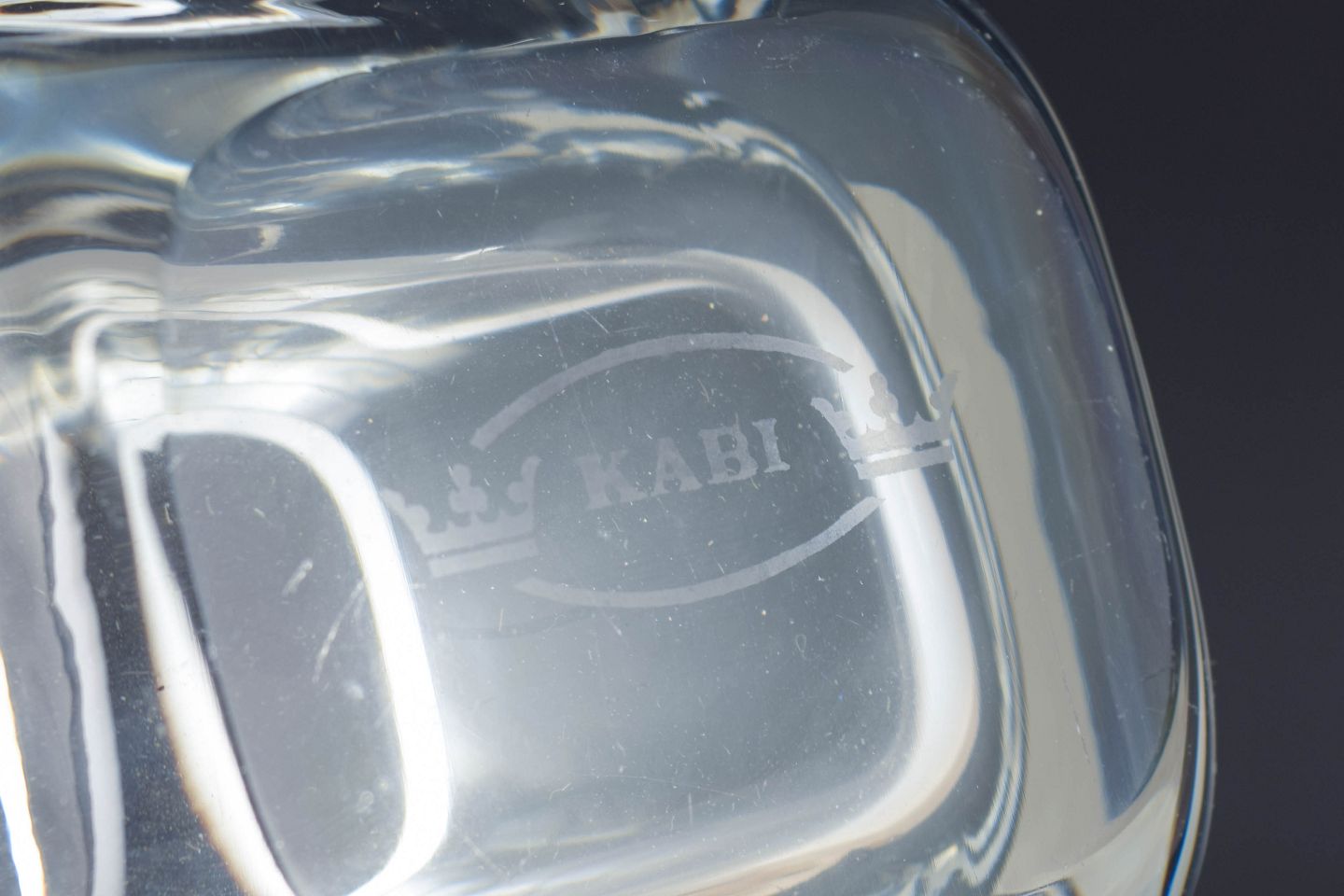 Kraftig, mundblæst glasvase med blødt afrundet, kvadratisk grundform og tyk, klar kant. Bærer en svagt ætset mærkning “KABI” i bunden.