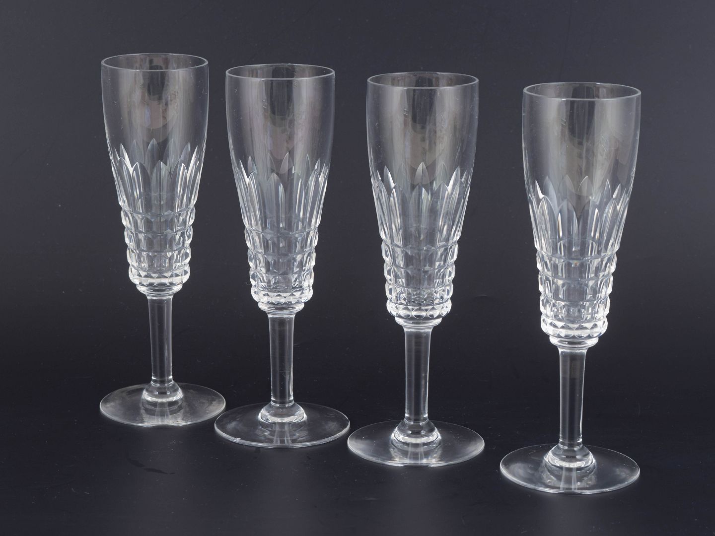 Sæt med fire franske champagneglas i klart krystal med facetteret kumme og klassisk stamme. Form og slibning giver et elegant lysspil og et tidstypisk udtryk fra midten af det 20. århundrede.