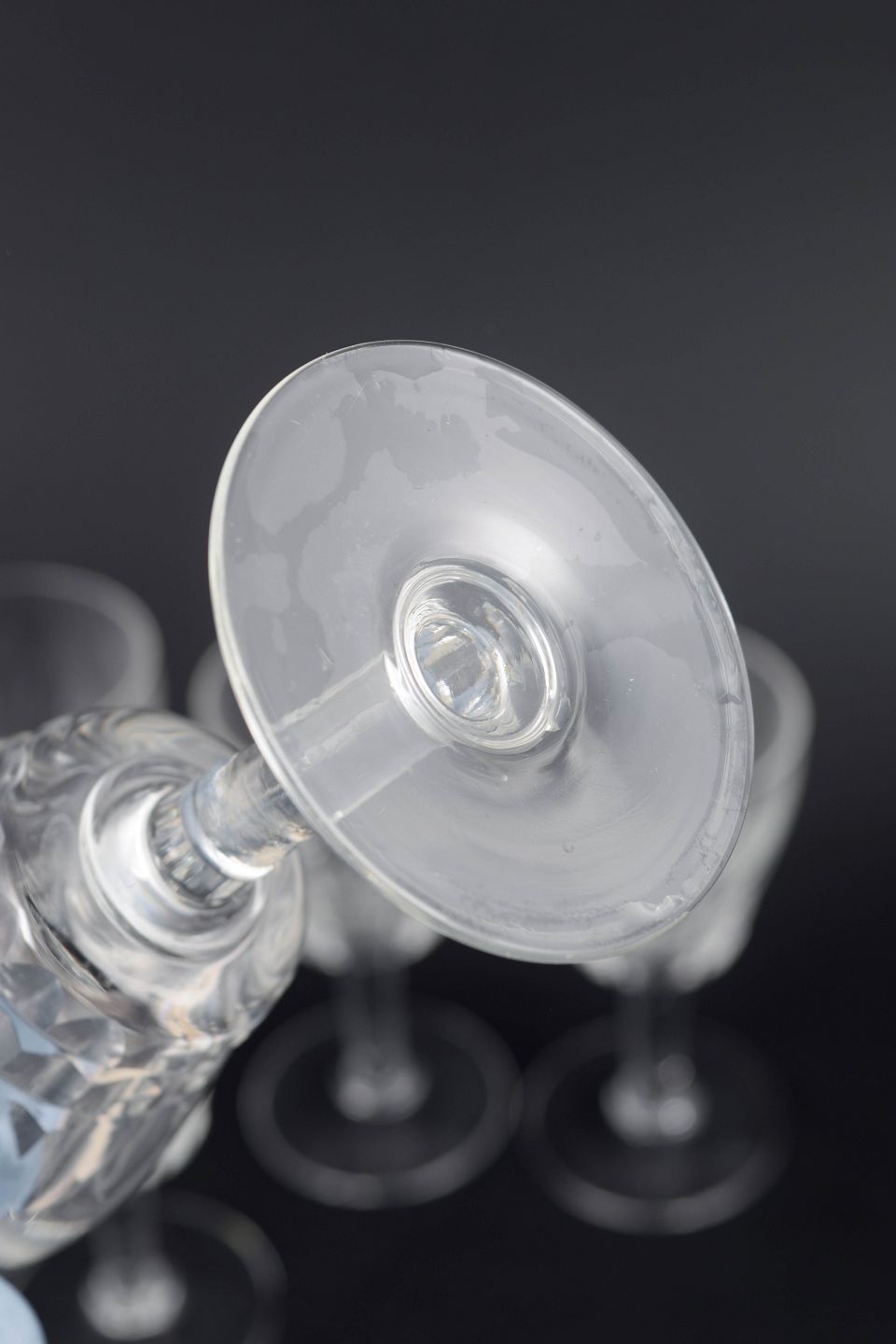 Sæt med syv franske portvinsglas i klart krystal med facetteret kumme og klassisk stamme. Form og slibning giver et elegant lysspil og et tidstypisk udtryk fra midten af det 20. århundrede.