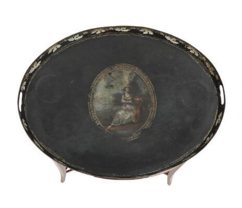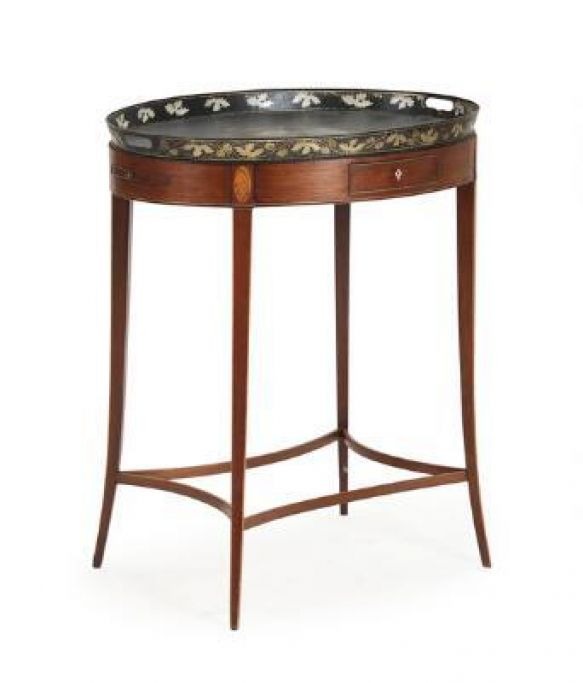Ovalt Regency bakkebord af mahogni, ca. 1800, dekoreret med intarsia i form af konkylie, sarg med skuffe samt blindskuffe, sider med lysholdere, forsynet med bakke af sortmalet metal med motiv i form af siddende kvinde. H. 75 cm. B. 50 cm. L. 65,5 cm.