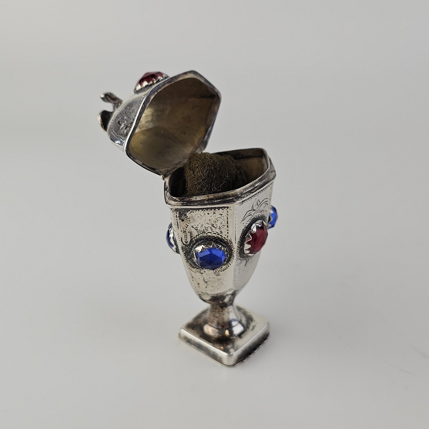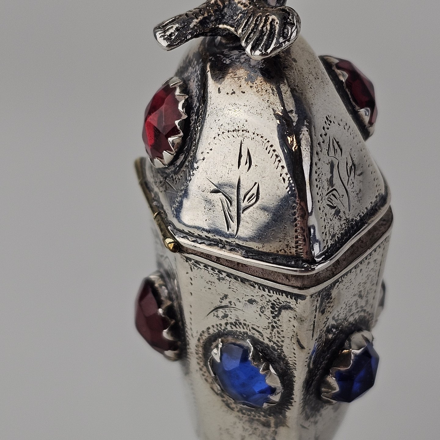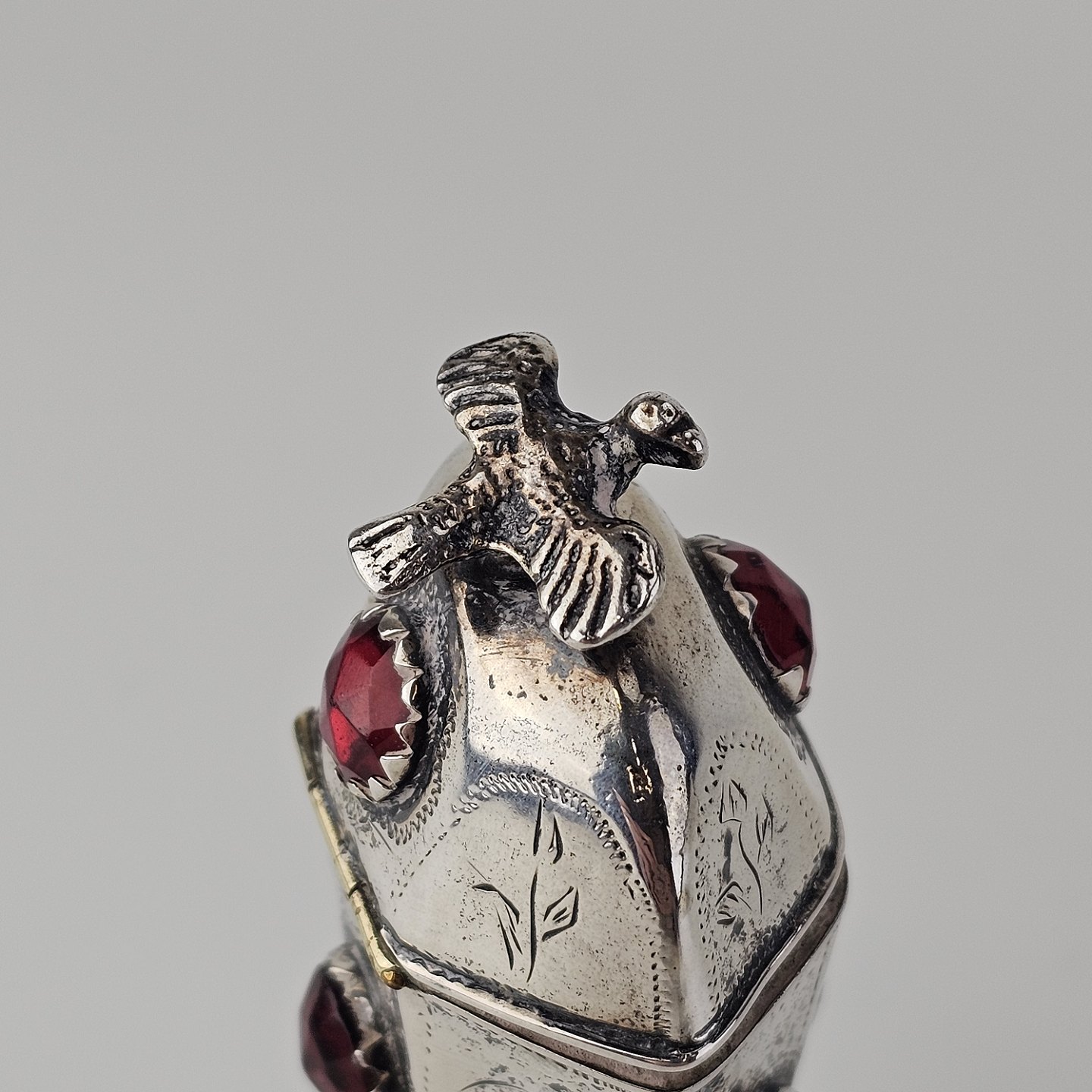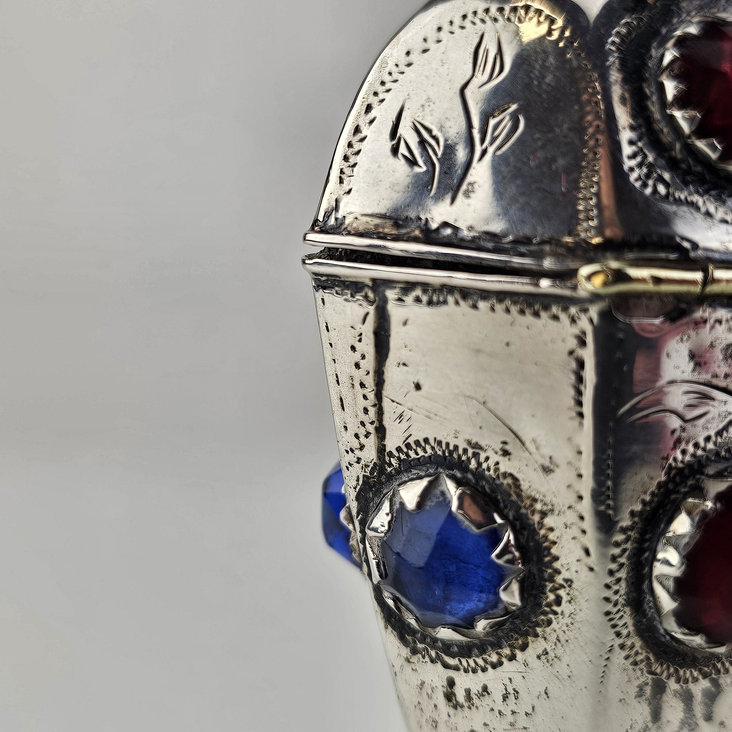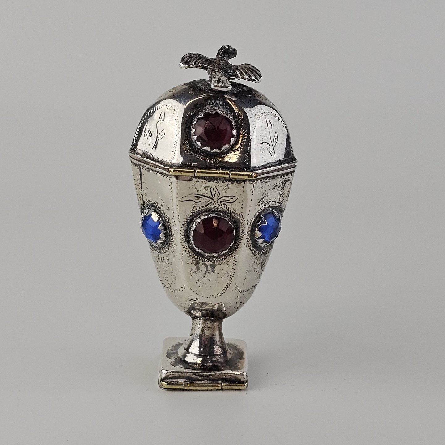 Hovedvandsæg i sølv dekoreret med forskellige smykkesten og en fugl på toppen