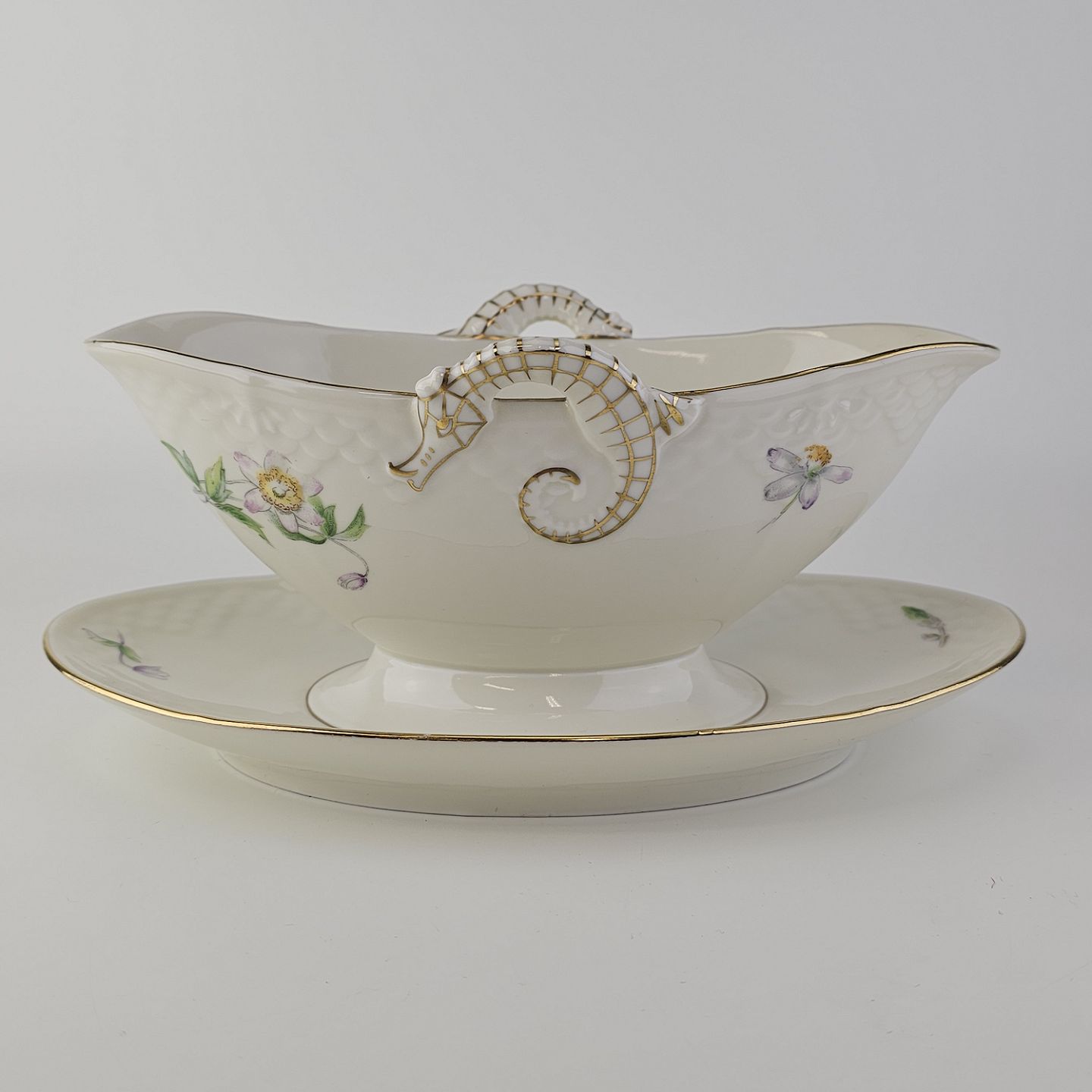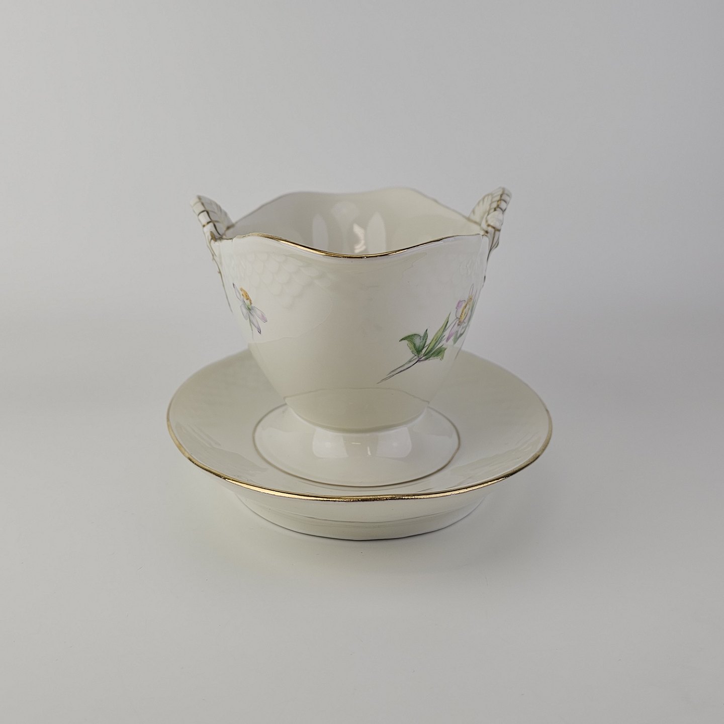 Frigga Anemone er cremefarvet porcelæn dekoreret med motiv af anemoner og bøgeløv med guldkant