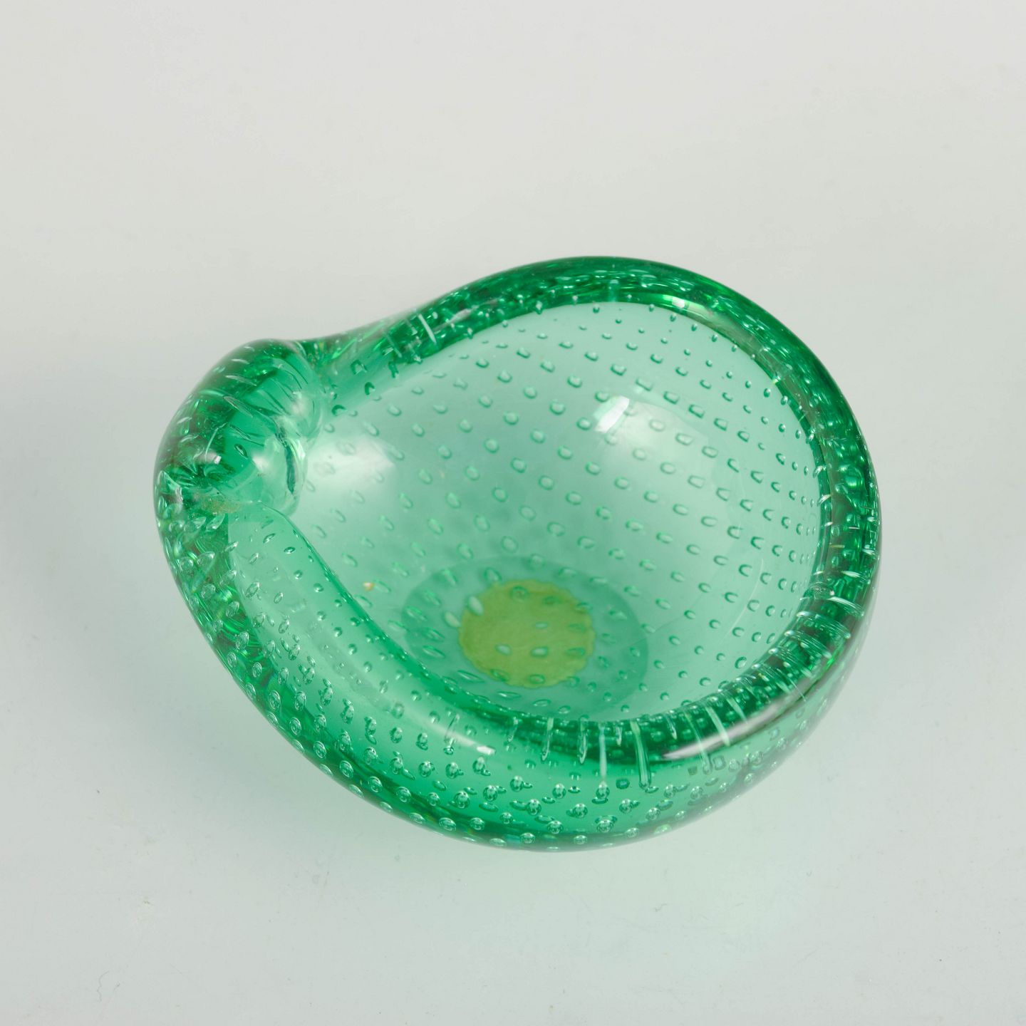 Organisk formet lille skål i grønt kunstglas med indsmeltede bobler og prikket overfladestruktur, med original “Made in Murano Italy” klistermærke.