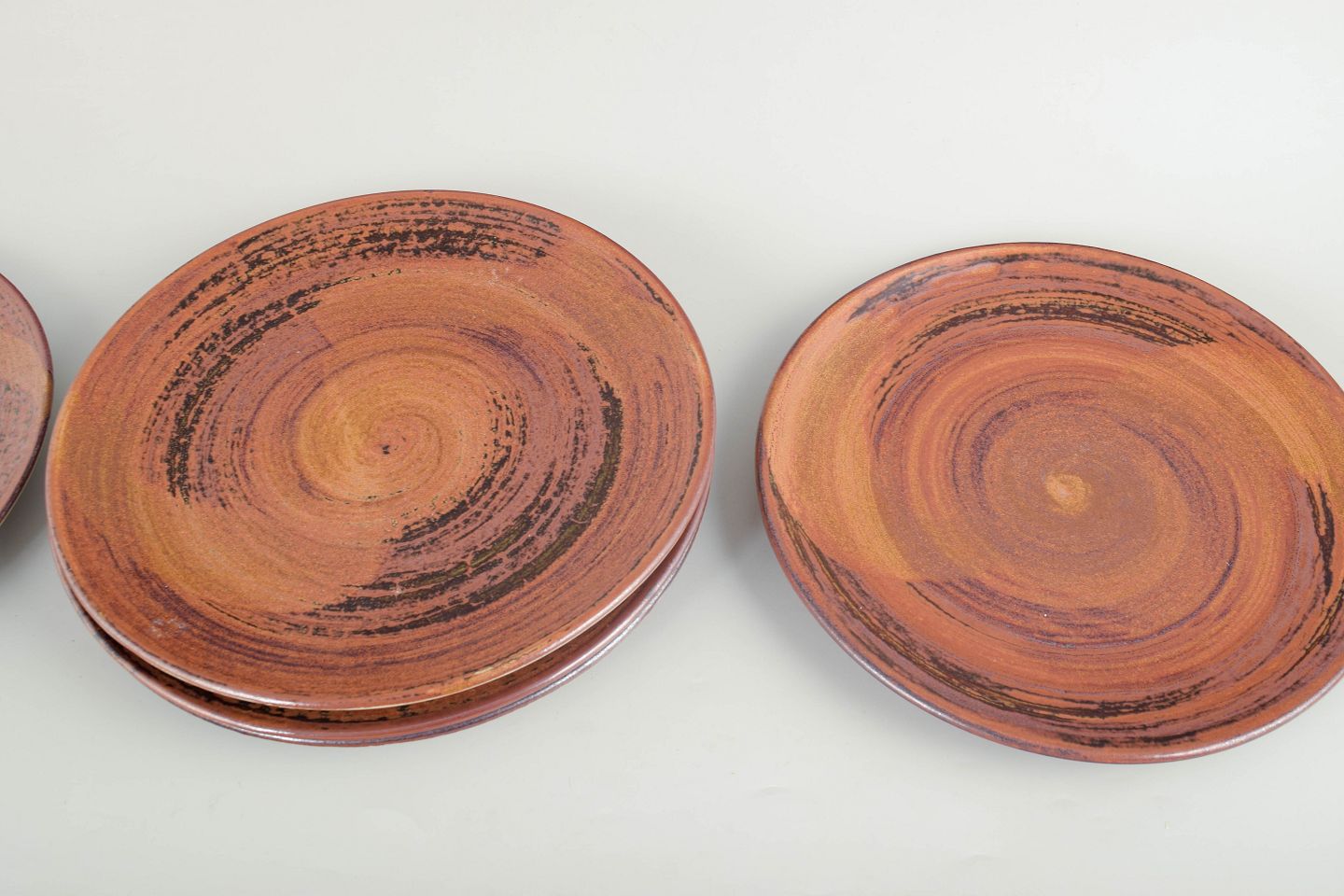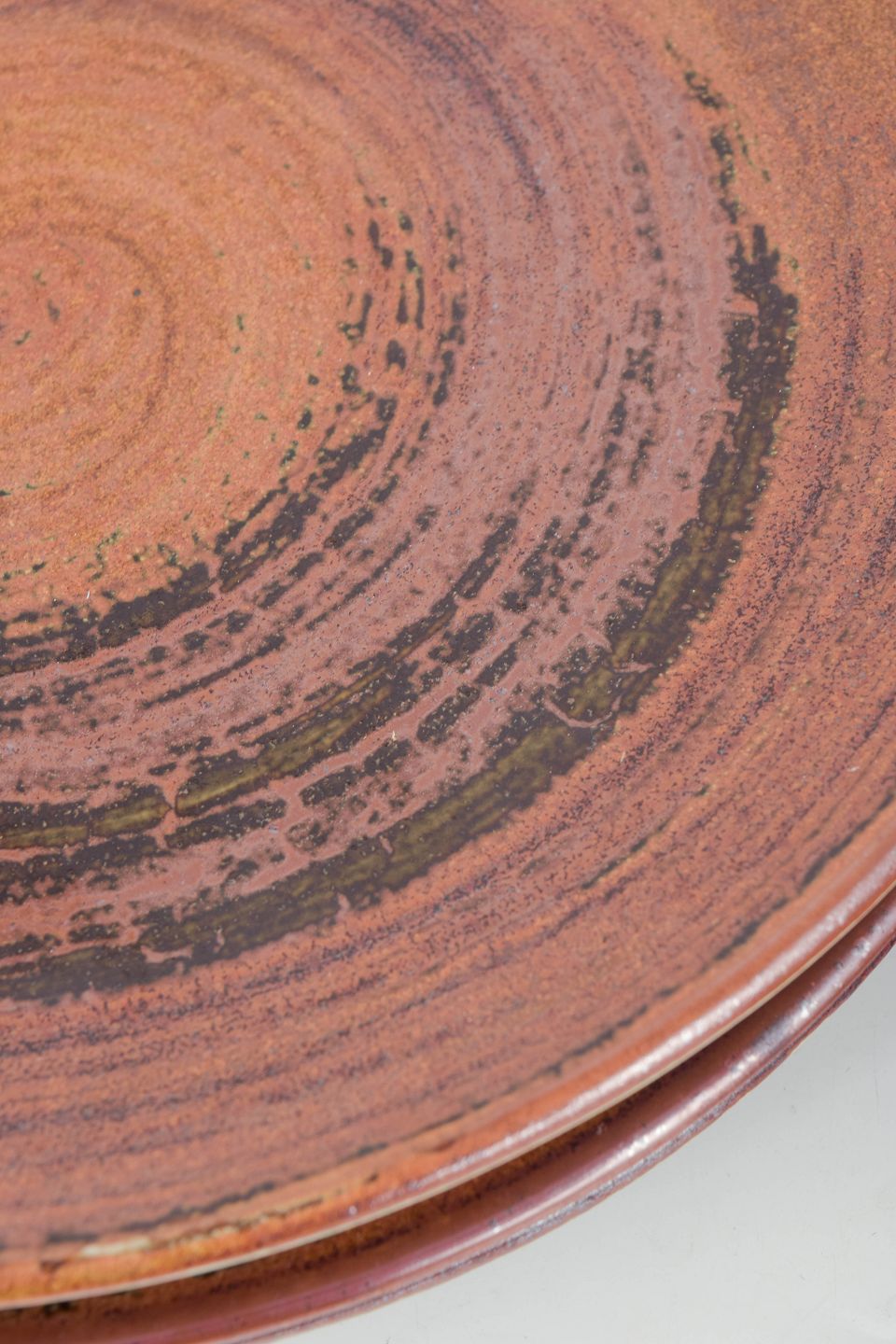 Hånddrejede middagstallerkener i stentøj med varm brunlig og kobbertonet glasur i cirkulært drejet mønster, hver tallerken med let variation i udtryk.