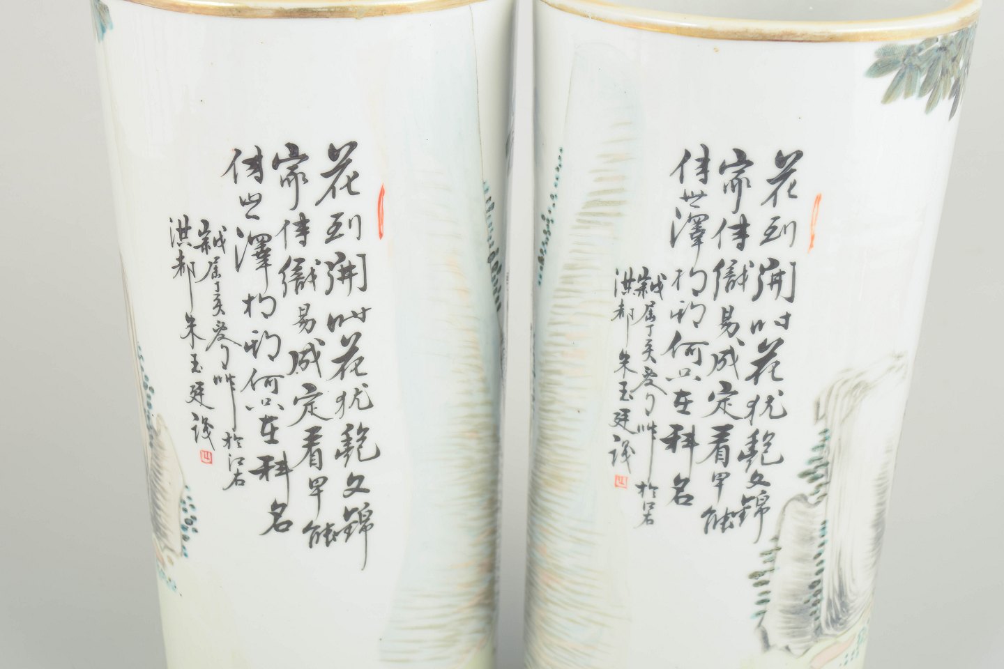 Par cylindriske vaser i porcelæn, hånddekoreret med figurscener i emaljefarver samt kalligrafi og segl. Den kalligrafiske tekst kan oversættes til: “Blomsternes duft er ren og vidtrækkende; de elegante blomster afspejler en forfinet smag og udtrykker ro, harmoni og samklang mellem natur og menneske.”