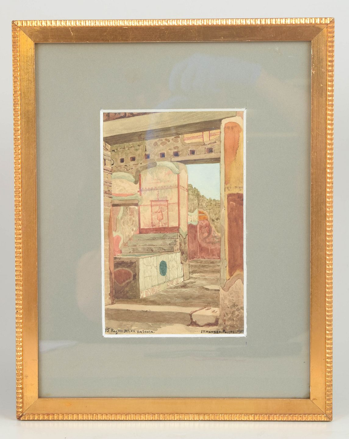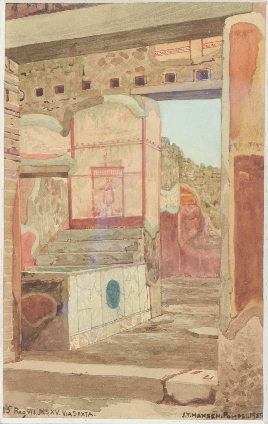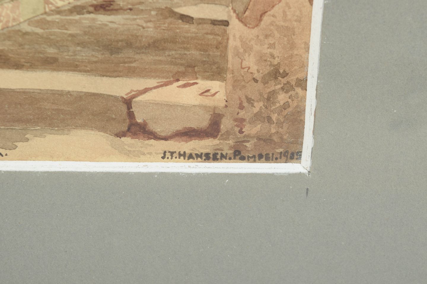 Arkitektonisk motiv fra Pompeji med klassiske bygningsfragmenter og rumlige perspektiver, udført som akvarel i dæmpede jordfarver og varme okkertoner. Signeret og dateret, Pompeji 1905.