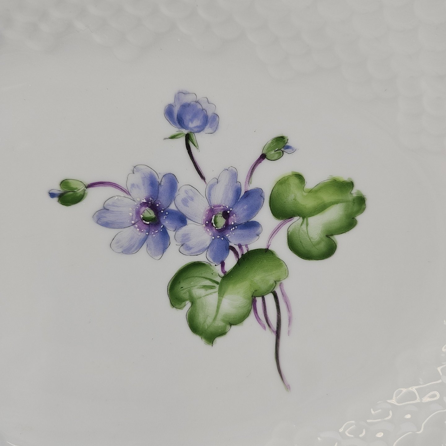 Antonius er af hvidt porcelæn med skælform dekoreret med håndmalede blå anemoner og guldkant. Også kendt under navnet Blå Anemone.