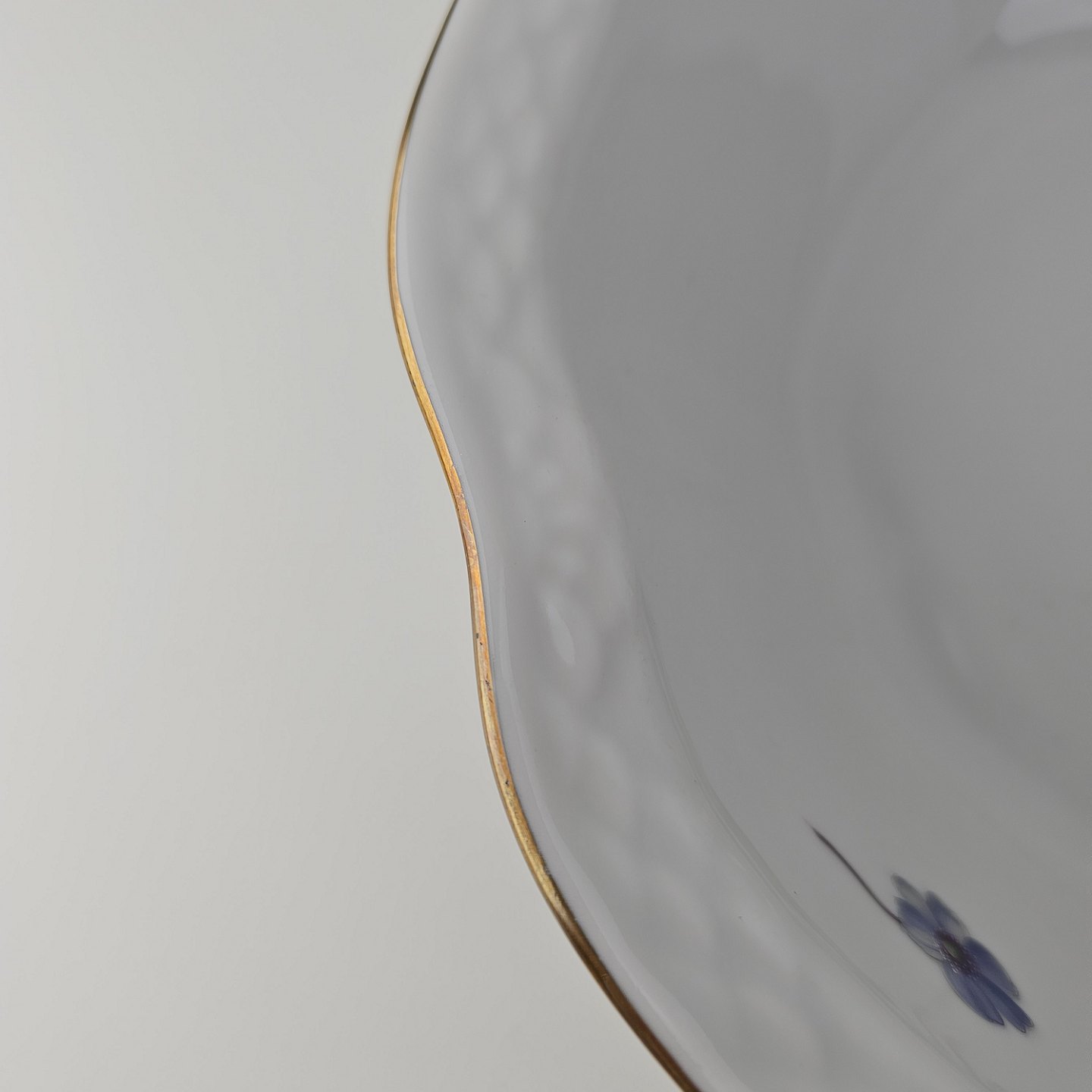 Antonius er af hvidt porcelæn med skælform dekoreret med håndmalede blå anemoner og guldkant. Også kendt under navnet Blå Anemone.