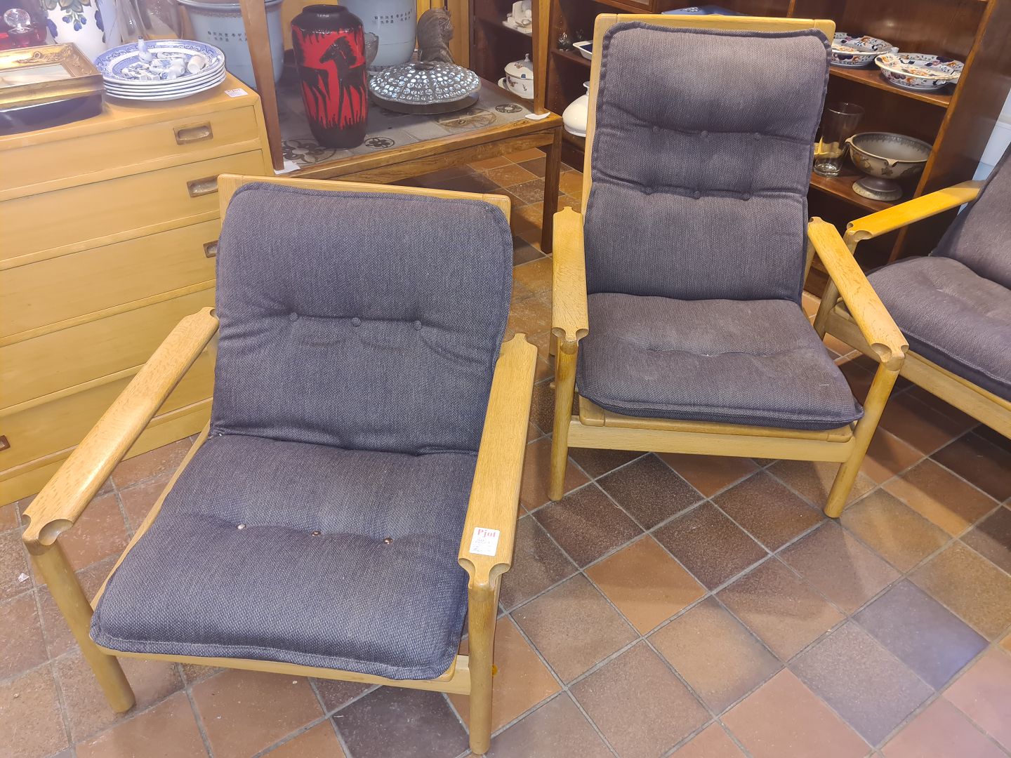 Sofagruppe udført i massiv lakeret eg m. hynder i uldstof. Produceret af Madsen & Schubell Møbelfabrik ca. 1970'erne. Fremstår i pæn brugt stand.