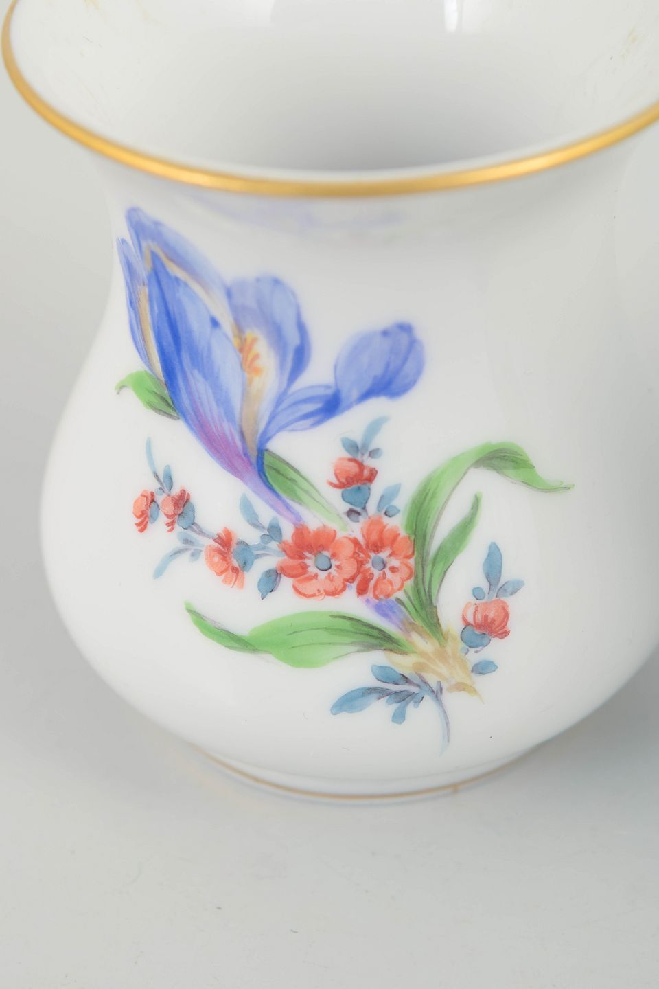 Små balusterformede miniaturevaser i hvidt porcelæn, dekoreret med håndmalede polykrome blomsterbuketter og afsluttet med forgyldt rand. Mærket i bunden med Meissens krydsede sværd.