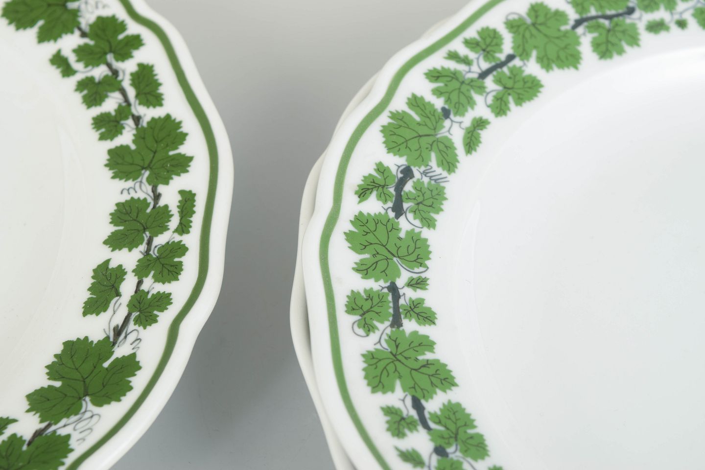 Runde porcelænstallerkener dekoreret med grøn vinløvsbort langs kanten. Nogle eksemplarer annulleret med to indridsede streger, andre med fire indridsede streger. Mærket med Meissens krydsede sværd. Én tallerken med et meget lille og ubetydeligt skår, se foto.