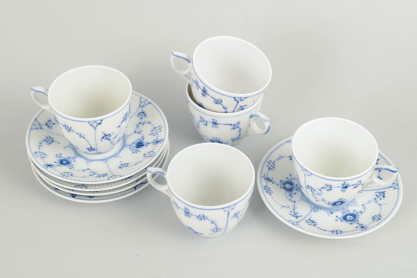 Fem kaffekopper med tilhørende underkopper i håndmalet underglasurblå dekoration i det klassiske Musselmalet riflet-stel. Kopper og underkopper model 1/2162. 1. sortering.