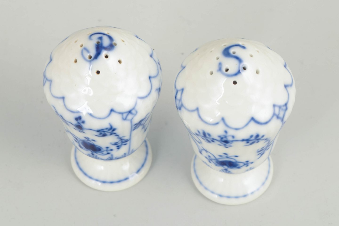 Salt- og peberbøsser i håndmalet underglasurblå dekoration i det klassiske Musselmalet riflet-stel. Modeller 1/467 og 1/480. 1. sortering.