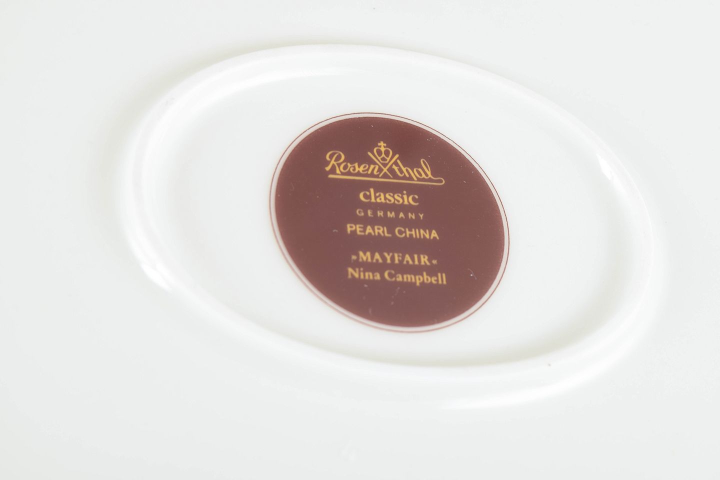 Sæt med to ovale fade i porcelæn fra Rosenthal Classic, dekoreret i serien Mayfair med mørk bort, stiliserede grønne bladranker og gulddetaljer, produceret i 1980’erne.