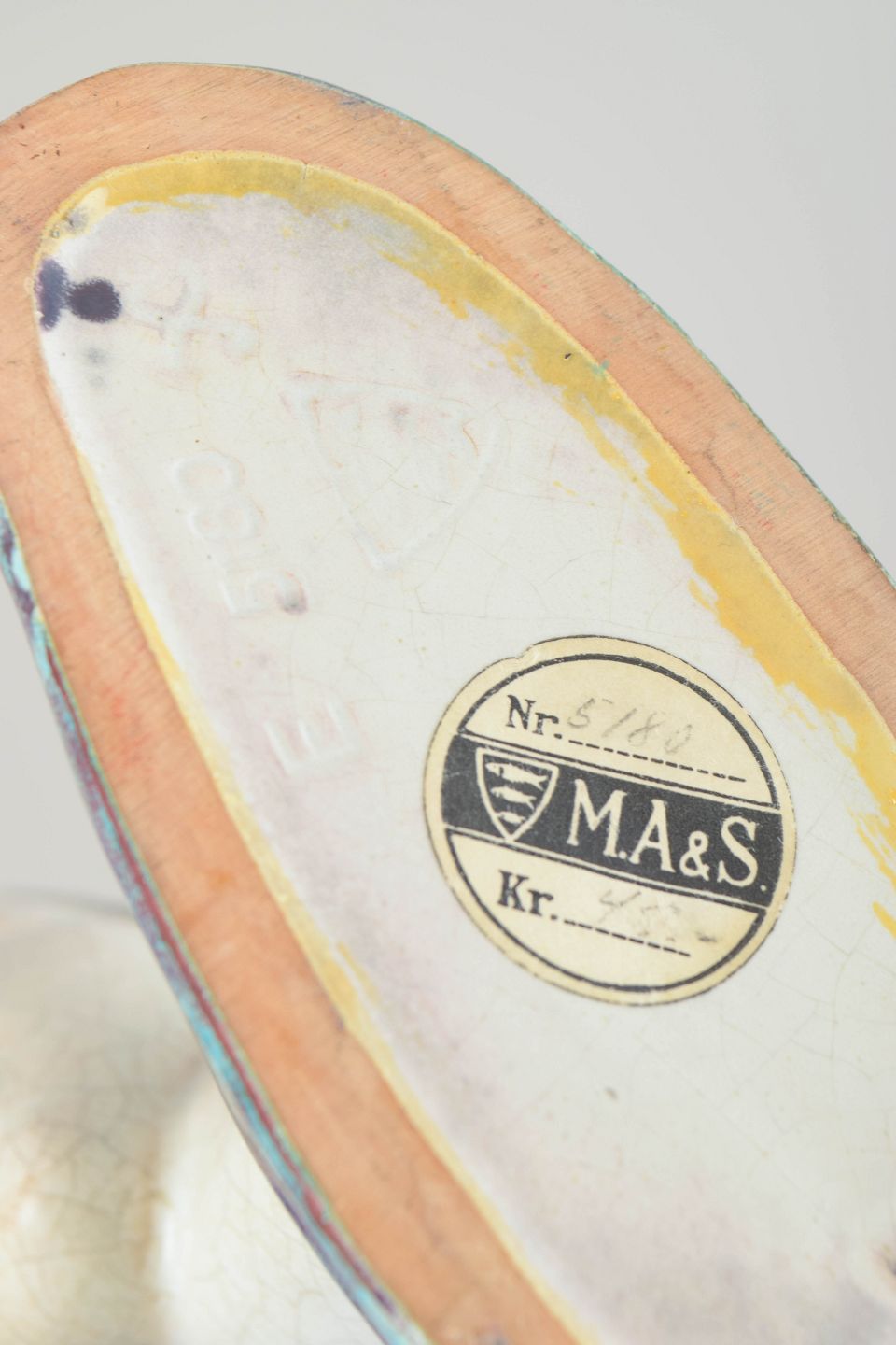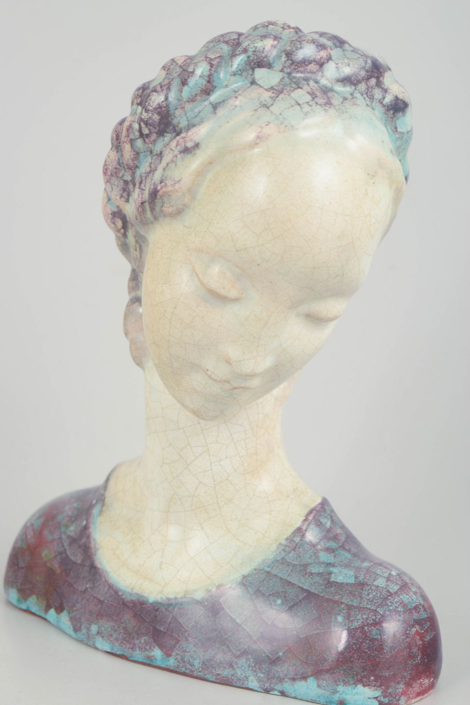Elegant kvindebuste i stentøj udført i Art Deco-inspireret stil med stiliseret hår og let nedadbøjet hoved. Glaseret i dæmpede, krakelerede nuancer af creme, violet og turkis. Fremstillet på Bornholm og stemplet under bunden med værkets ovale M.A.&S.-mærke.