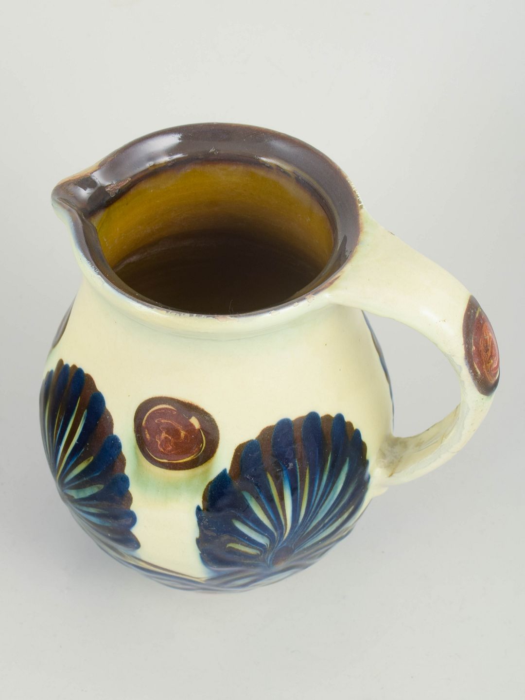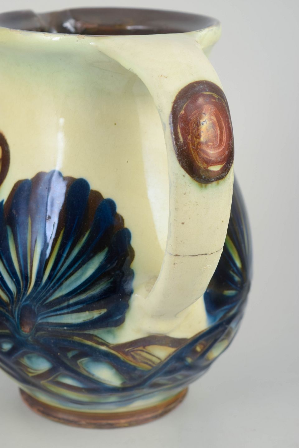 Kande i glaseret stentøj med markant reliefdekoration i form af stiliserede blad- og båndmotiver i blå og grønne nuancer på lys bundglasur. Formen er kraftfuld og balanceret med tydelig hank og hældetud, og dekorationen er integreret i godset som et plastisk element, der giver et levende samspil mellem form og overflade.