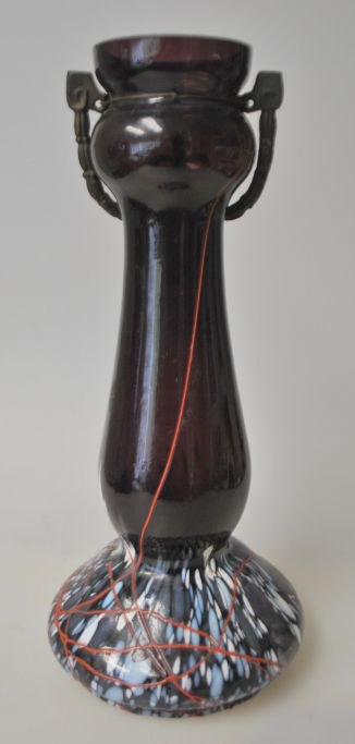 Jugend vase, ca. 1900, Tyskland. Violet glas med fod af hvidt, blåt og gråt glas. Ovenover rødt glas linie. Foroven monteret med bronze dekoration. H.: 25,2 cm.