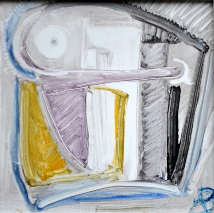 Brügger, Ane (1908 - 1995) Danmark: Komposition. Keramik flise bemalet i gult, lilla, blåt og grå nuancer. Signeret: AB. H: 32,5 cm. B: 32,5 cm.