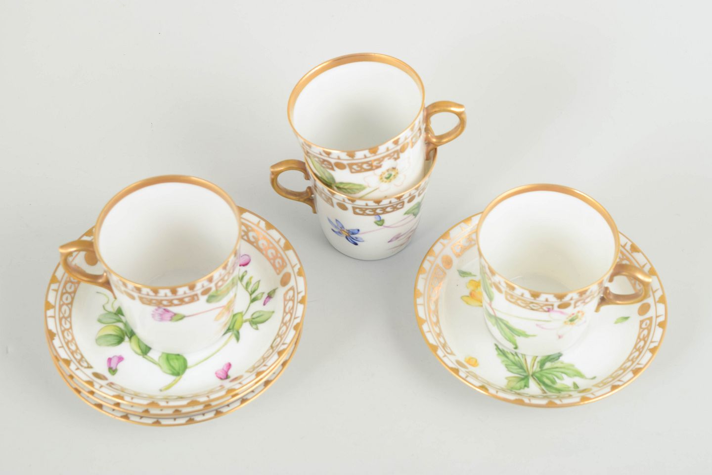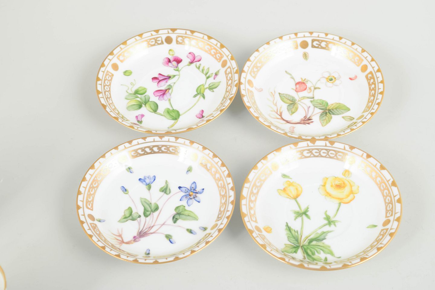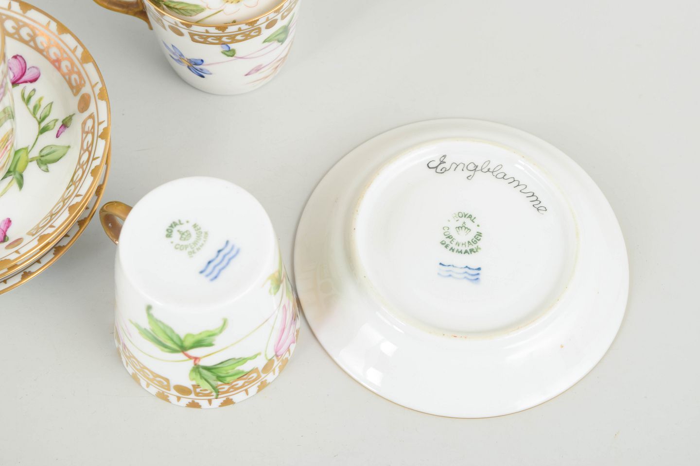 Porcelæn i Flora Danica-stil med håndmalede botaniske motiver og forgyldt kant.