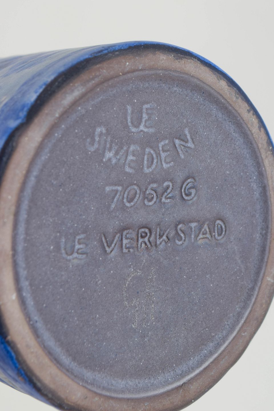 Cylinderformet vase i stentøj med lysegrå bundglasur og hånddekoreret blåt mønster i organiske, gentagne former. Kort hals med let profileret munding. Stemplet i bunden med UE Sweden, Upsala Verkstad samt modelnummer 7052 G.