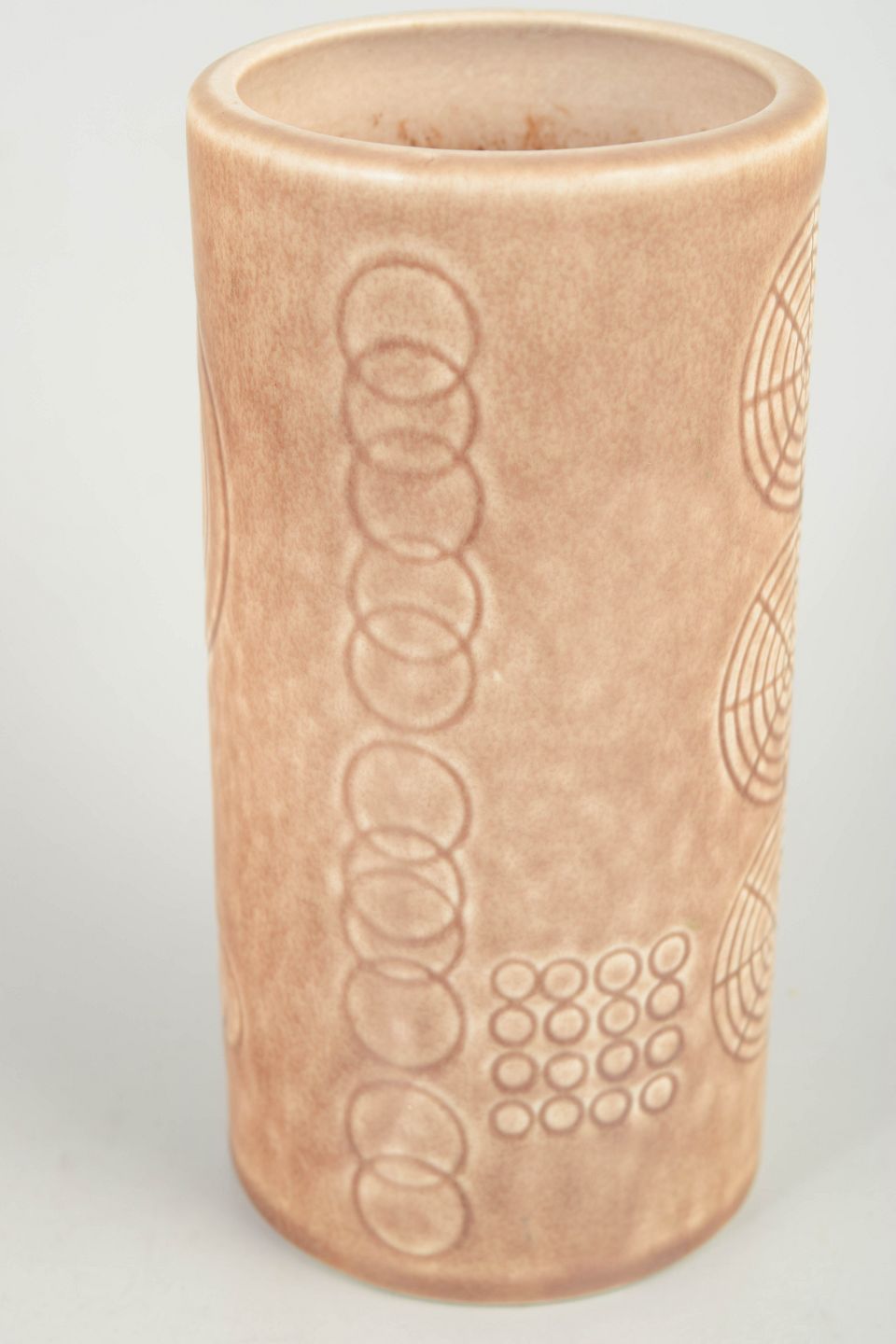 Cylinderformet vase i stentøj med mat, sandfarvet glasur og reliefdekoration med cirkulære og geometriske motiver. Modelnavn “Sarek” angivet i dekorationen.