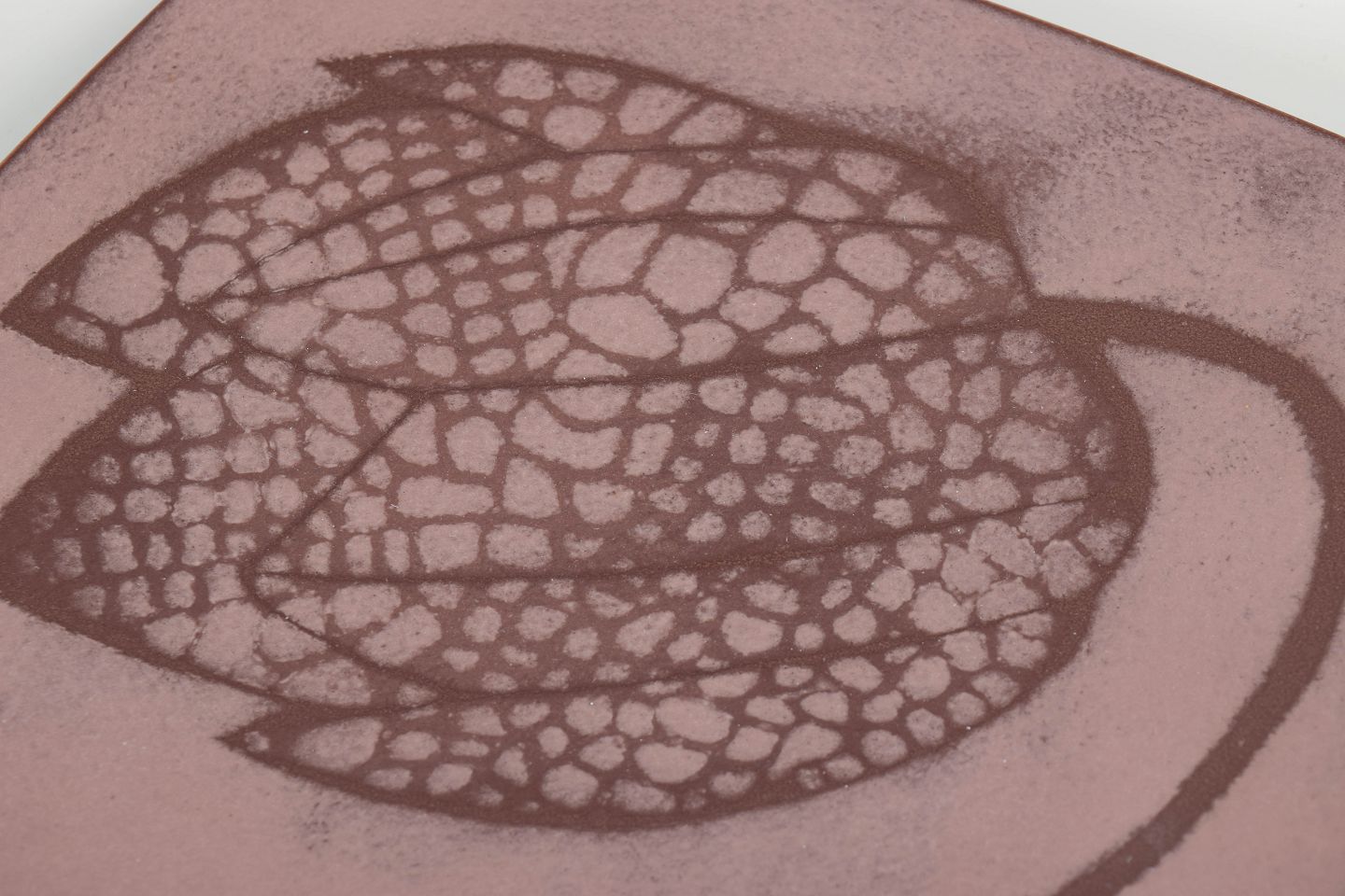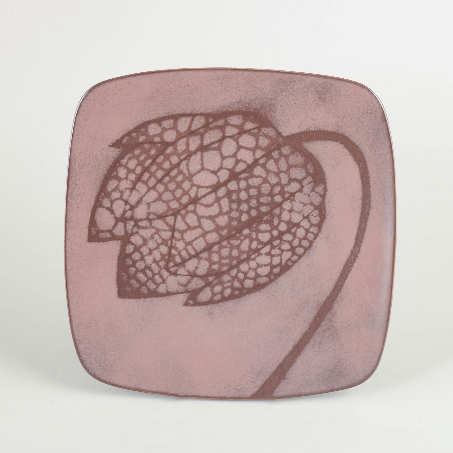 Square stoneware dish with a subdued pink glaze and a stylised leaf motif in darker tones. Signed Ann Pentik on the base. Unique work from Pentik Studio.