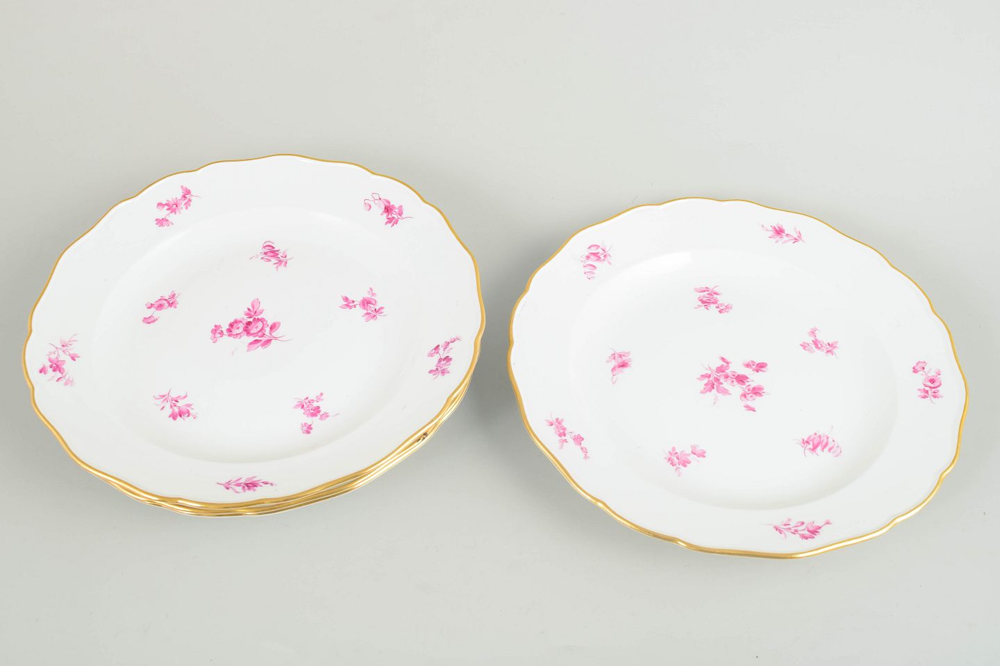 Porcelænstallerkener med let bølget fane, forgyldt kant og håndmalet dekoration i rosa blomster. Klassisk Meissen-udtryk fra perioden omkring år 1900.